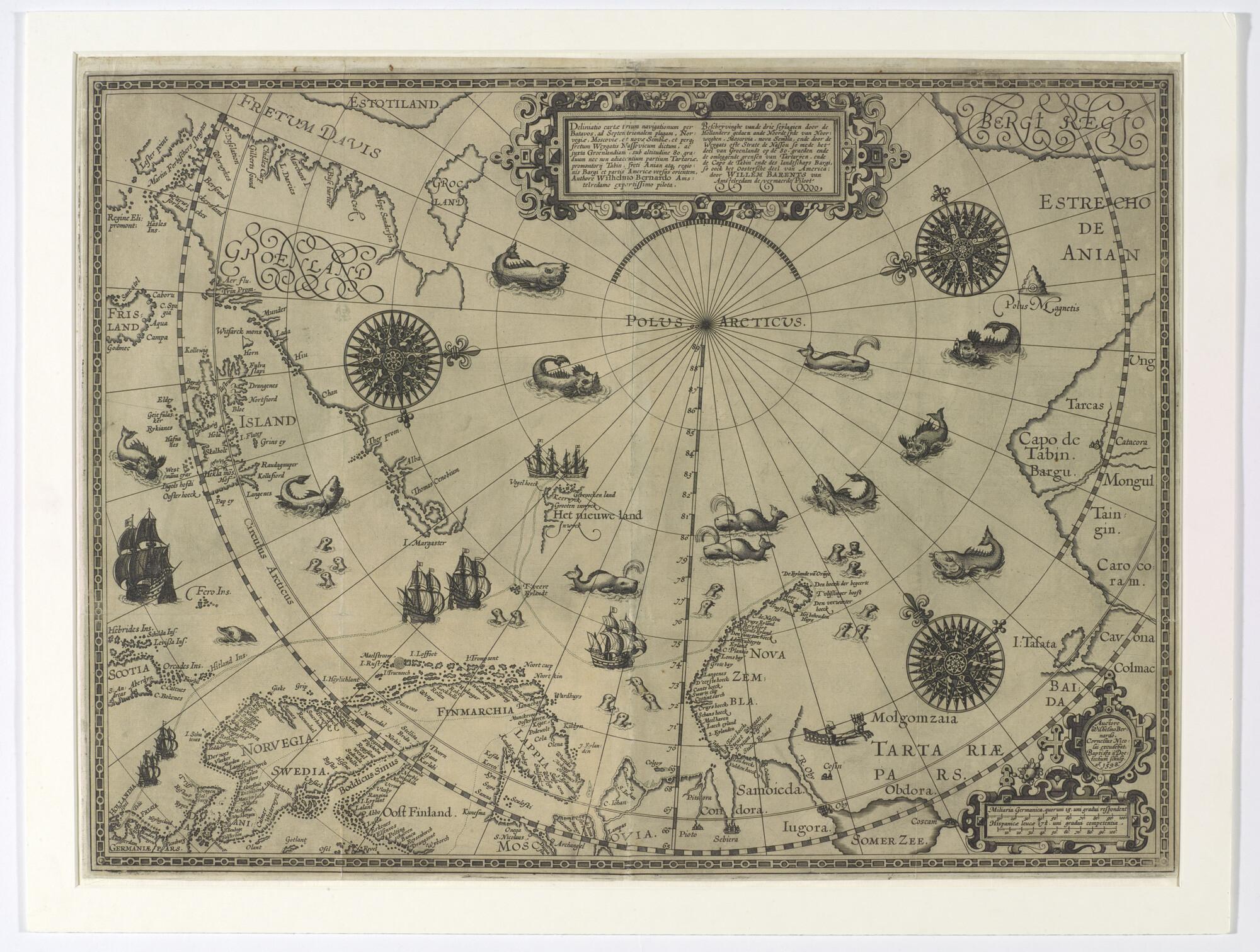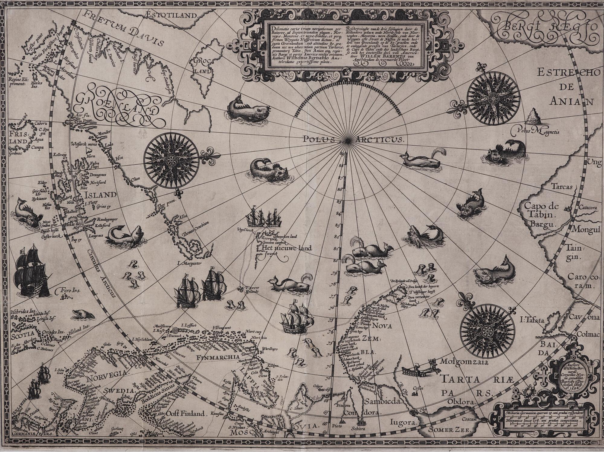 Kaart van de Noordelijke IJszee door Willem Barentsz., postuum uitgegeven door Cornelis Claesz., Amsterdam 1598. Dit is de eerste kaart waarop het mythologische "arctisch continent" niet meer voorkomt. Wel zijn opgenomen het door Barentsz. op zijn drie reizen ontdekte Bereneiland ("'t Veere Eylandt"), Spitsbergen ("Het Nieuwe Land"), en Nova Zembla.