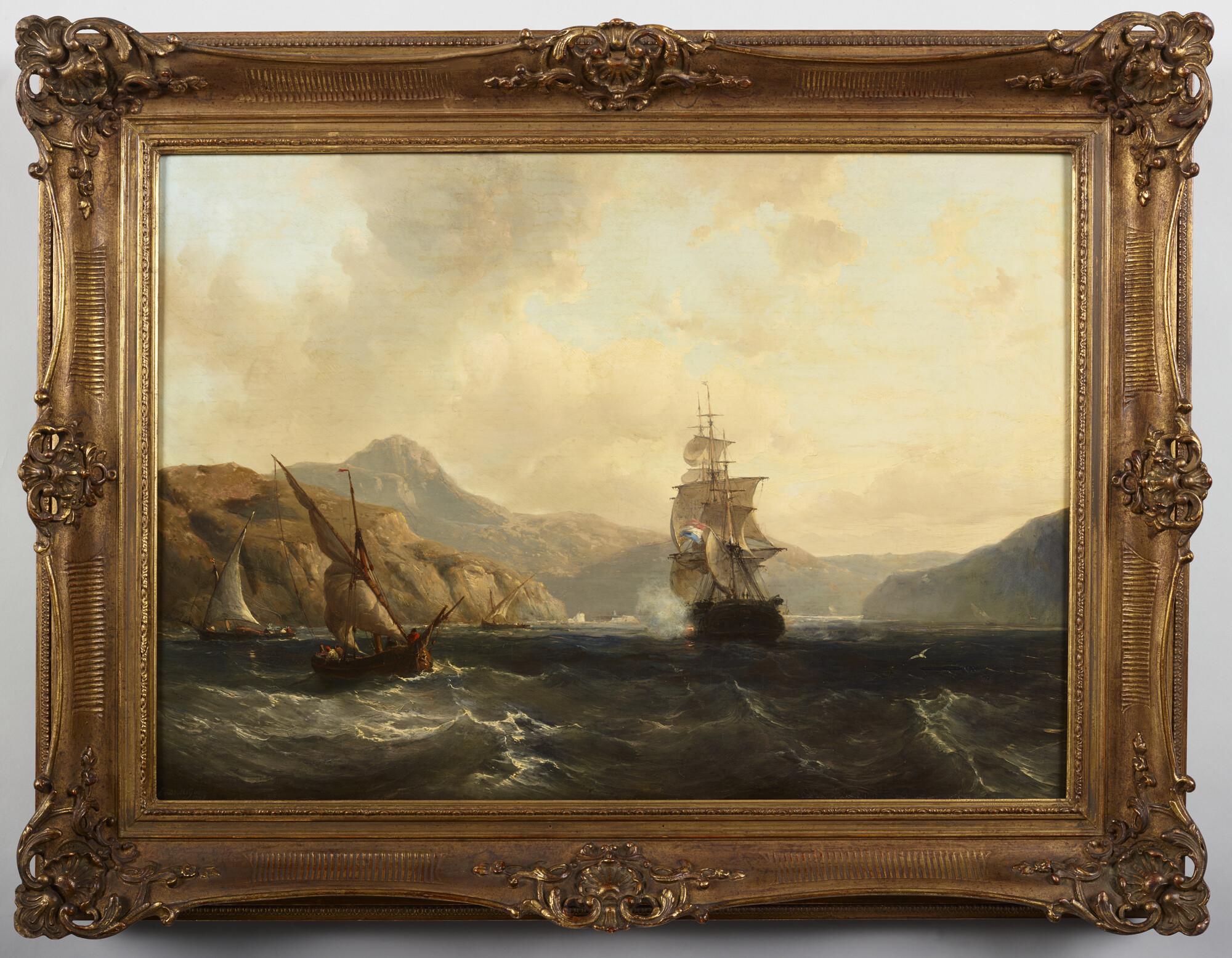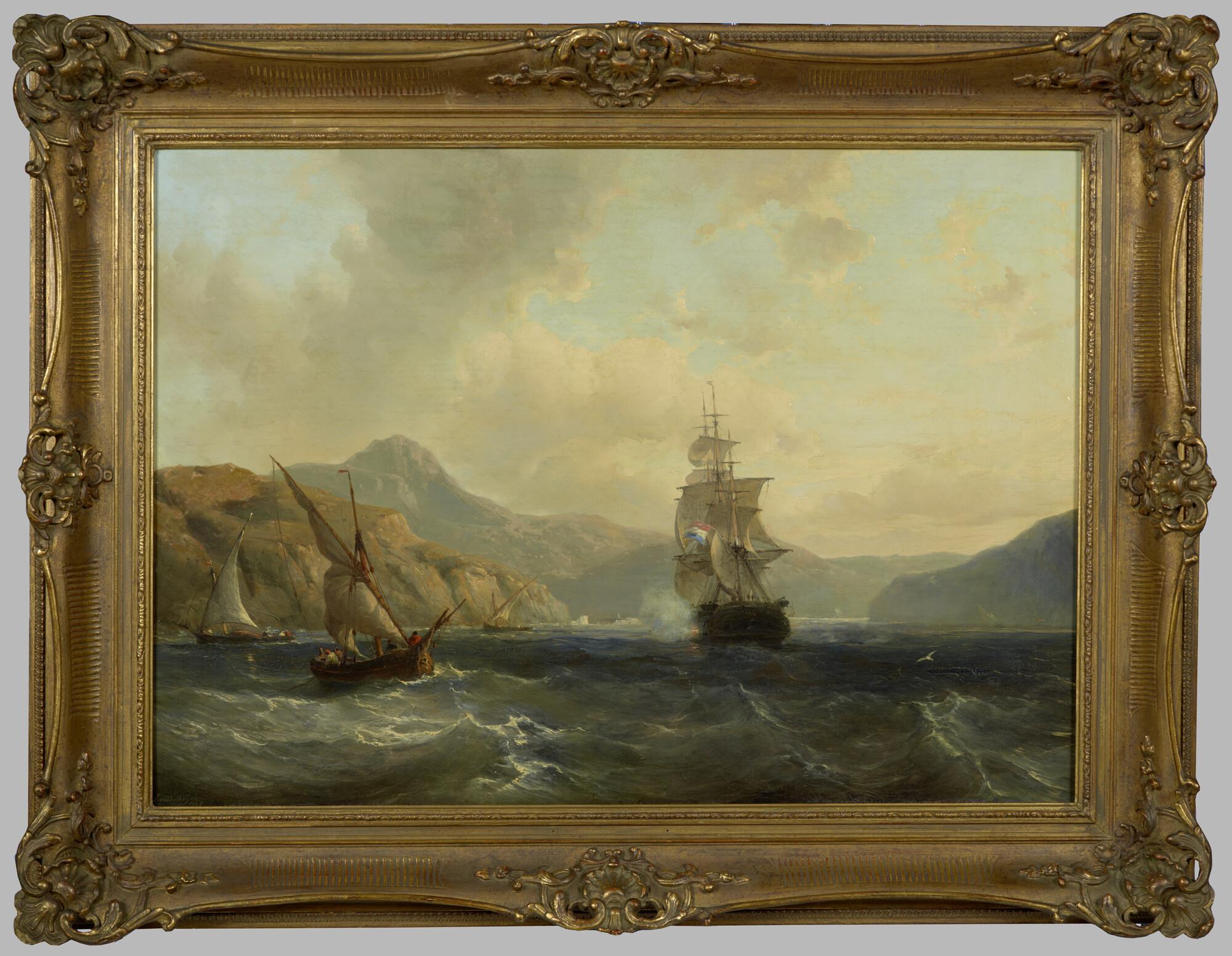 Voor een rotsachtige kust langs een baai in de Middellandse Zee vaart in het midden een Nederlands marinefregat, waarschijnlijk de Zr.Ms. Rijn onder bevel van prins Hendrik. Links op de voorgrond twee kleine lokale zeilschepen. In vergulde pâtelijst.