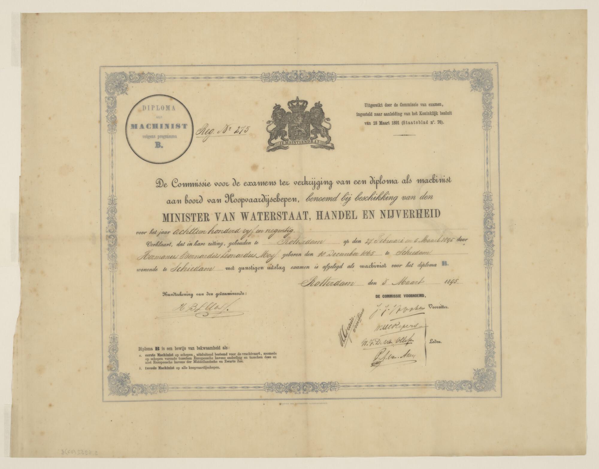 Diploma voor Machinist B, gedateerd 5 maart 1895, op naam van Hermanus Bernardus Leonardus Moss (geb. 18 dec. 1865).