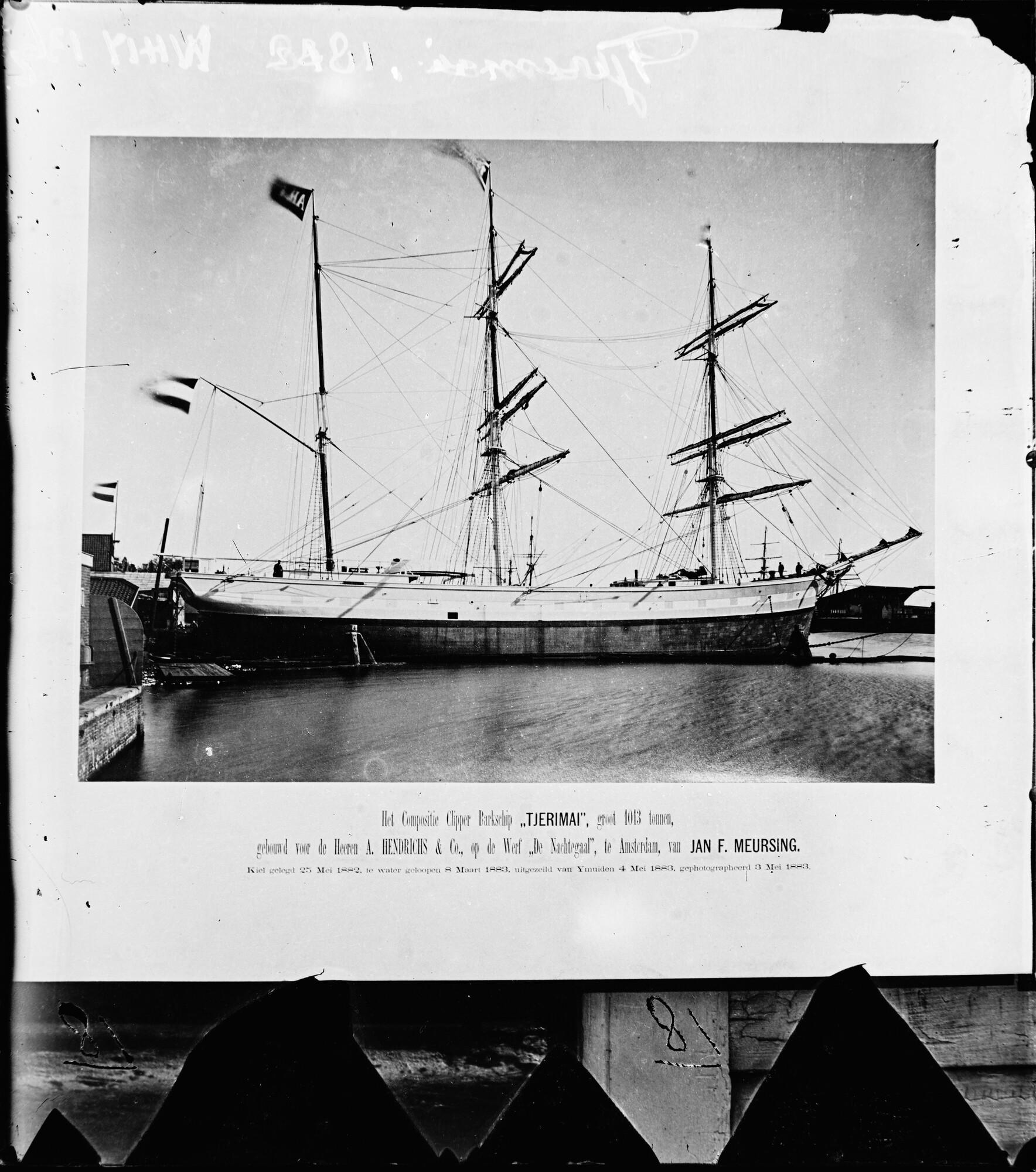 Gezicht op de werf De Nachtegaal met het composiet barkschip Tjerimai van de heren A. Hendrichs & Co., direct na de tewaterlating, 3 mei 1883 (Zijaanzicht).