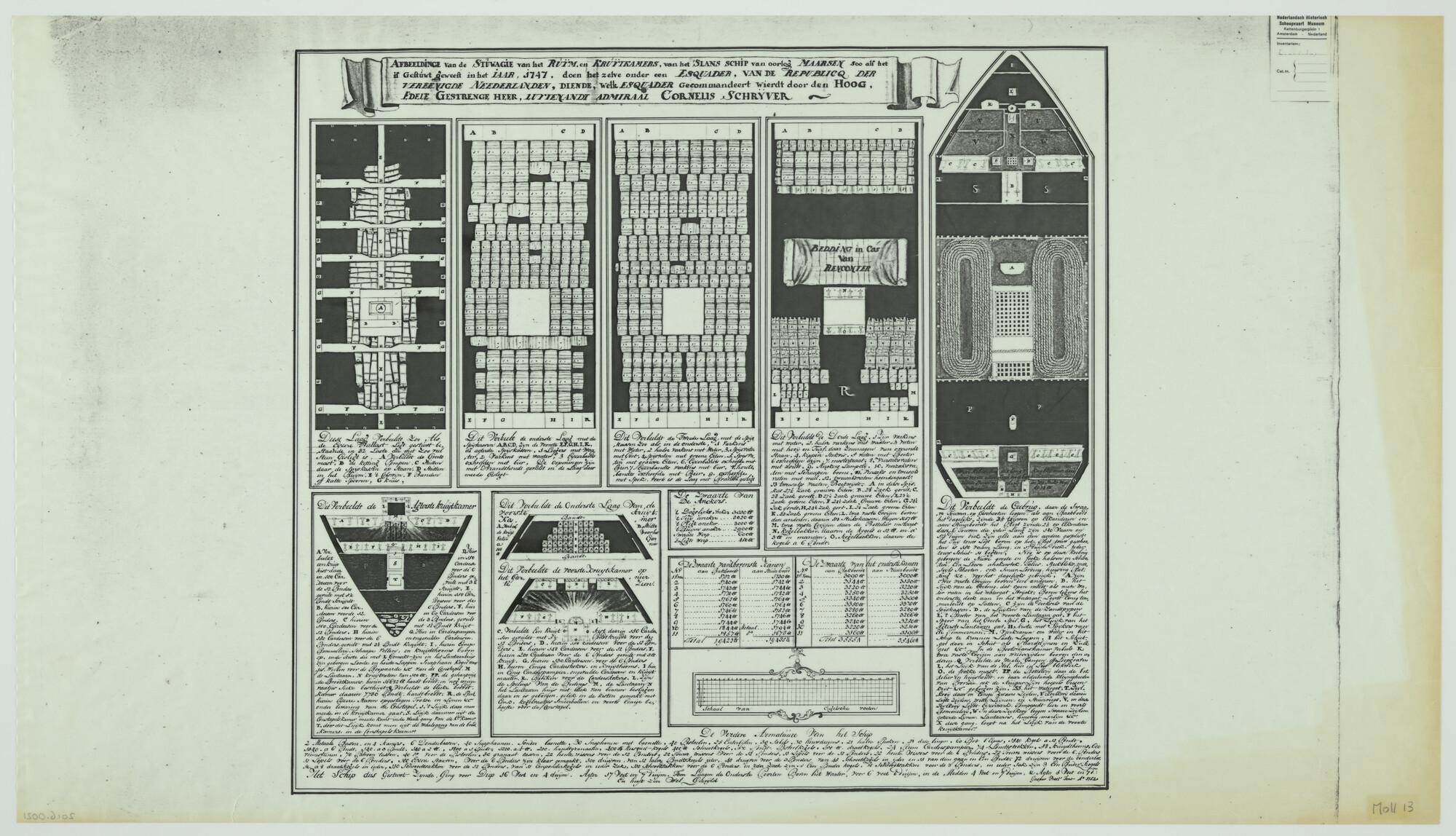 De stuwage in ruim en kruitkamers van 's Lands schip van oorlog Maarsen uit het eskader van vice-admiraal Cornelis Schrijver in 1747