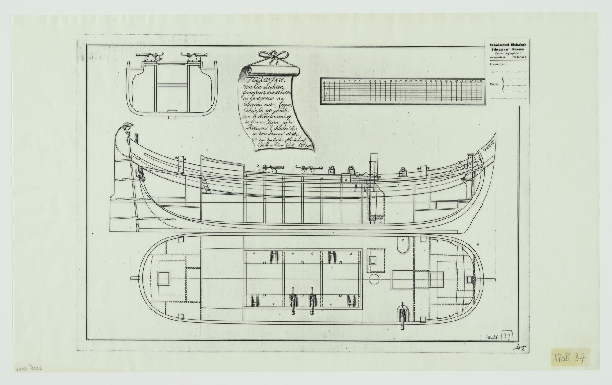 Zij- en bovenaanzicht en dwarsdoorsnede van een platbodem open lichter met roef. Bewapening: 14 draaibassen, 7 aan elke zijde. Roerkop versierd met gebeeldhouwde mannenkop met hoed. Mast. In 1748 in Nederlandse dienst op binnenzeeën, rivieren, De Schelde. Gebouwd in 1746 op 's Lands Werf door de eerste meesterknecht Willem van Gent.