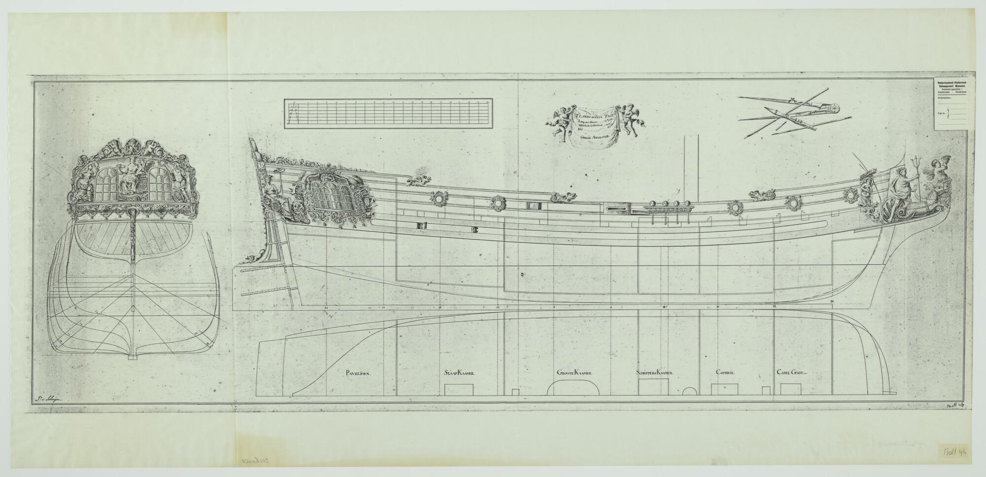 Lijnenplan, spantenraam, achteraanzicht van spiegel en hakkebord (met leeuw en twee klare stokankers geflankeerd door twee tritons) en zijaanzicht over stuurboord van een jacht - 's Lands Kleyne Yacht (1738) met mast en vijf sierlijke geschutspoorten in de zijde. Rijk gebeeldhouwde spiegel met twee ramen en in het midden de Nederlandse maagd. Boven het roerblad ...