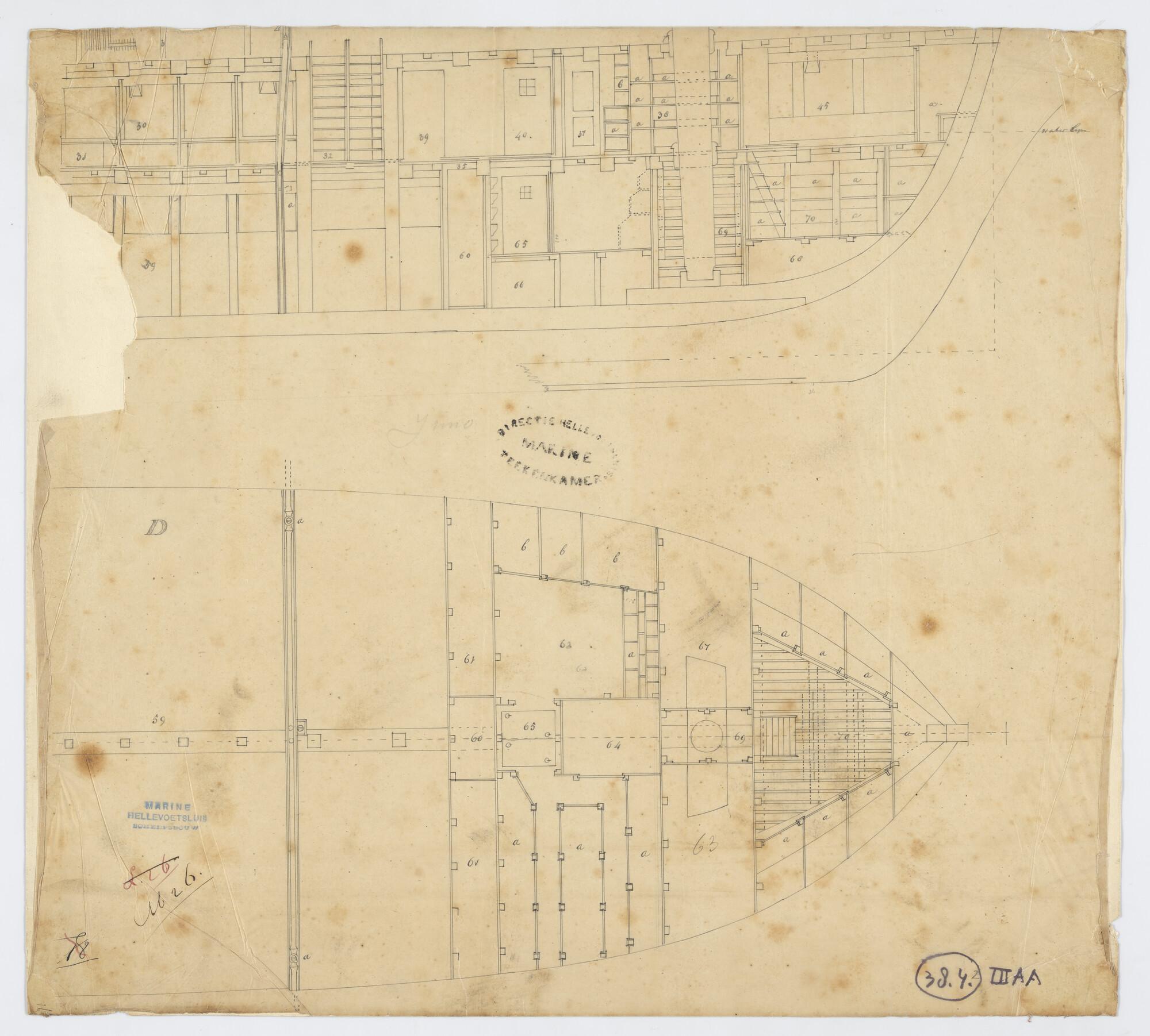 Verticale langsdoorsnede en bovenaanzicht ruim van het kuilkorvet Zr.Ms. Juno van 32 stukken.