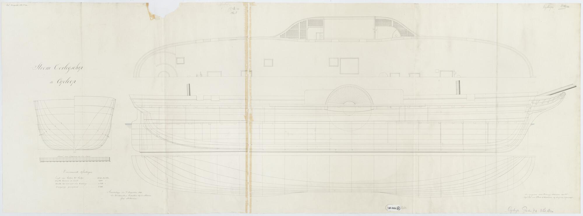 Het raderstoomschip 2de klasse Zr.Ms. Cycloop, 1840. Lijnenplan.