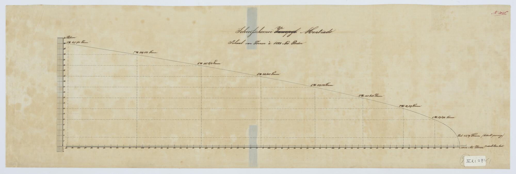 Schoener met stoomvermogen Zr.Ms. "Montrado", 1853 - 1854. Schalen van tonnen waterverplaatsing. (2 tekeningen).