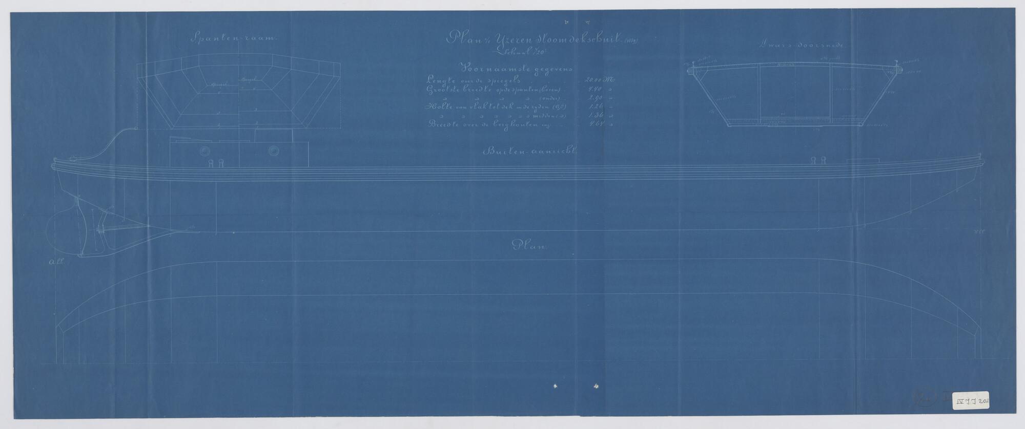 Plan van een ijzeren stoomdekschuit. Boven- en zijaanzicht, dwarsdoorsnede en spantenraam