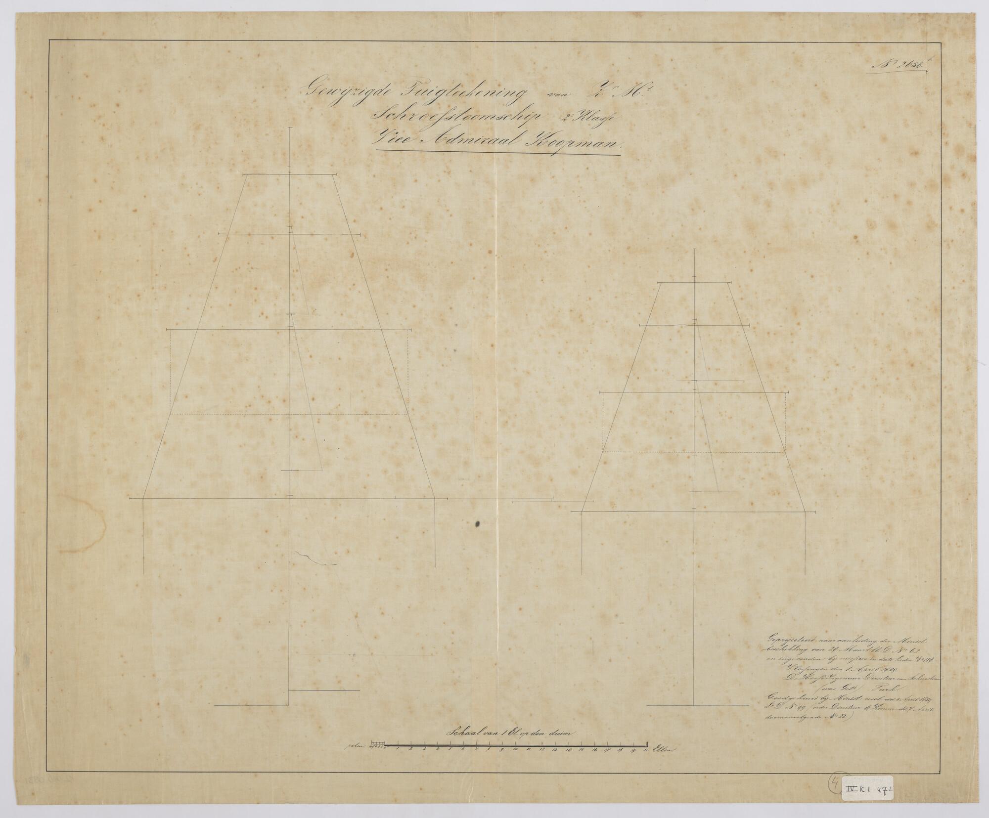 Schroefstoomschip 2de klasse Zr.Ms. "Vice Admiraal Koopman", 1856. 59.5 x 11 x 6.6 ellen. Gewijzigde tuigtekening (1859).