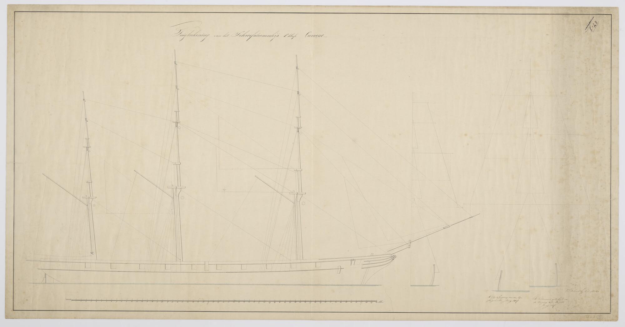 Het schroefstoomschip 1ste klasse Zr.Ms. "Curaçao", 1860. (ex- "Willem"). Tuigtekening.