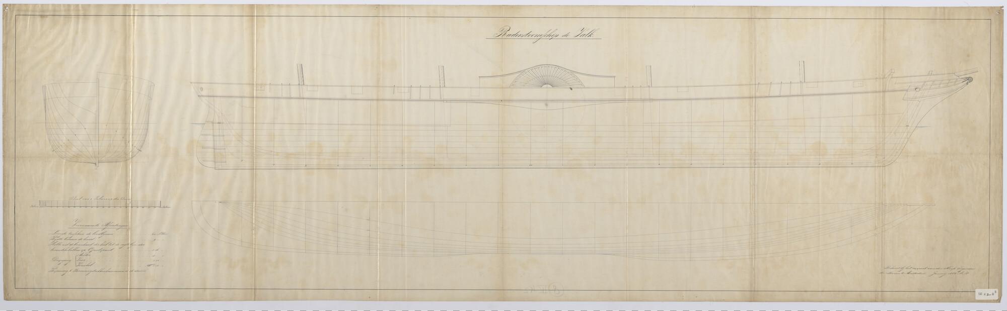 Het raderstoomschip Zr.Ms. Valk, 1863. (Koninklijke jacht vanaf 1883). lijnenplan, zijaanzicht, vooraanzicht, achteraanzicht.