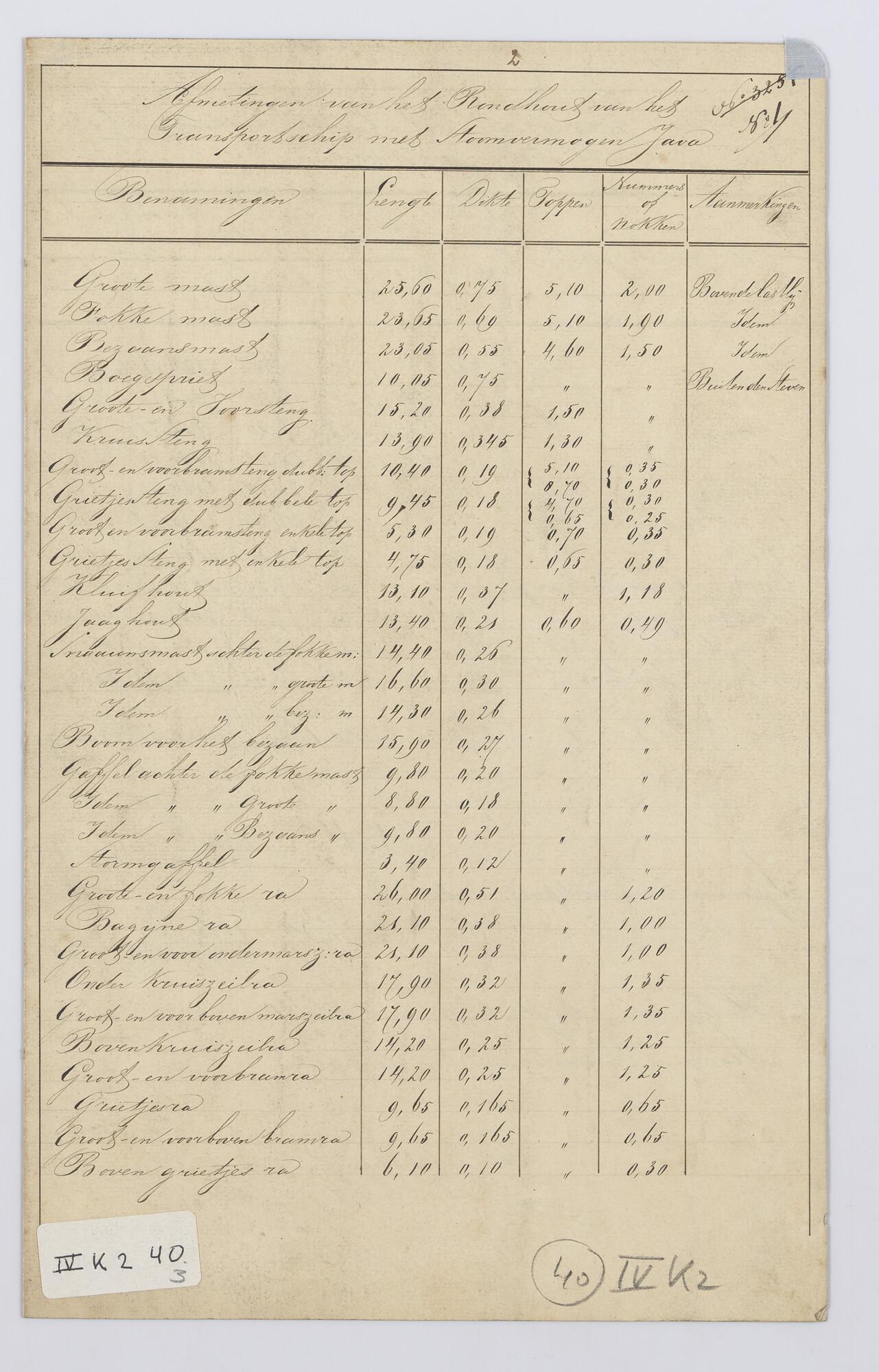 Het transportschip met stoomvermogen Zr.Ms. "Java", 1863. Bevestiging masten en boegspriet, lieren lopend wand, rondhout afmetingen.