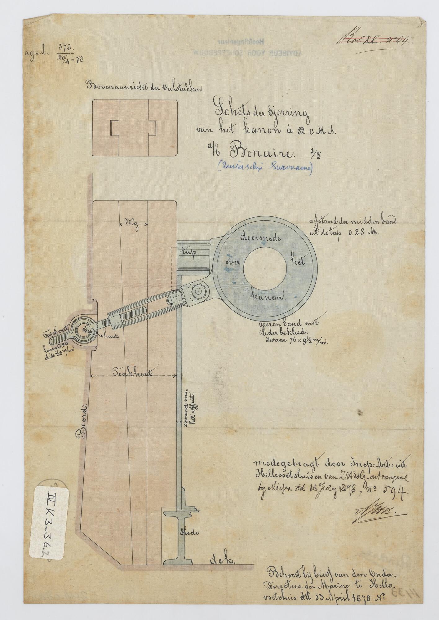Het schroefstoomschip 4de klasse Zr.Ms. "Suriname", 1876. Tuigplan en sjorring kanon van 12 cm.