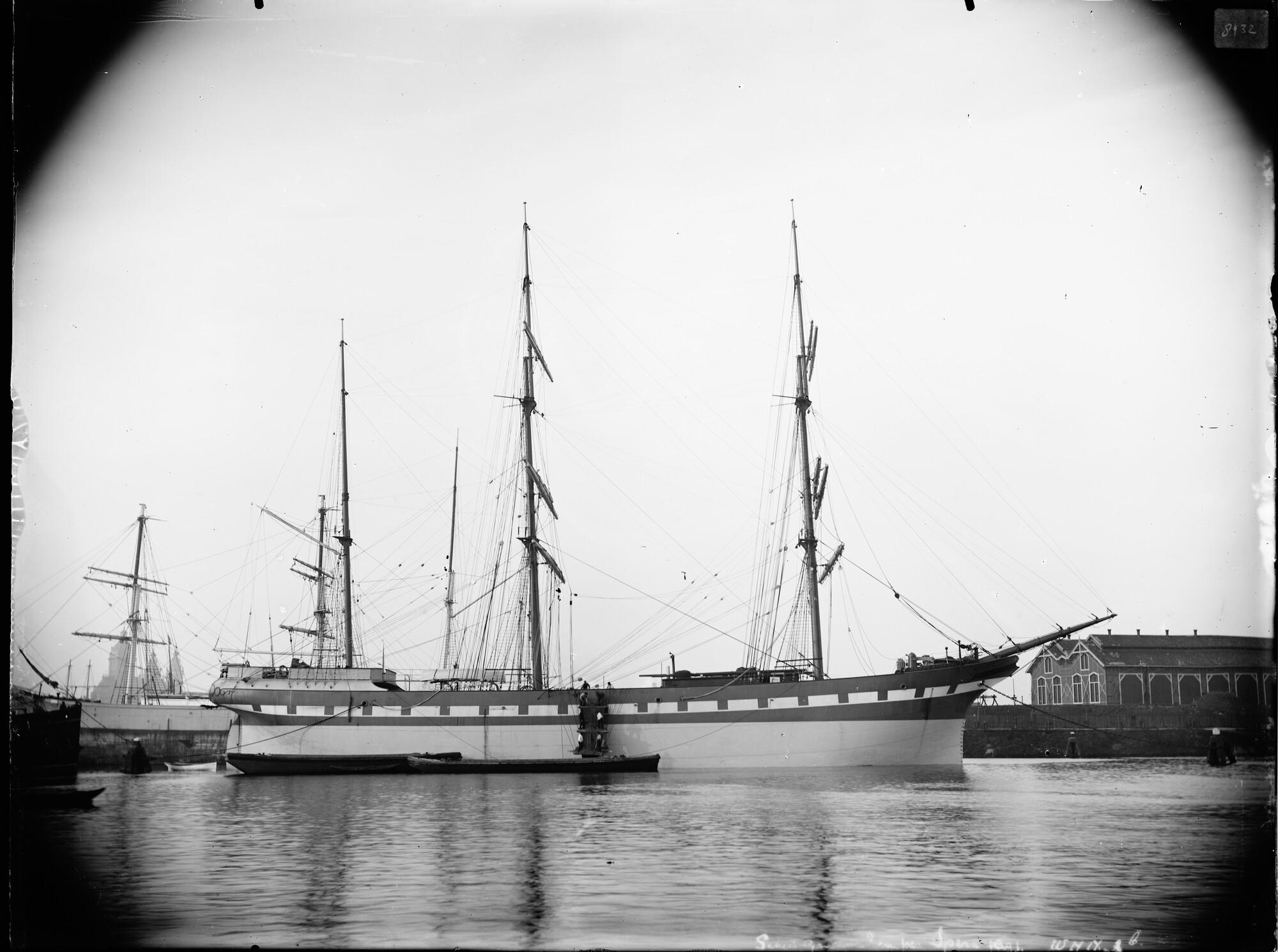 Glasnegatief van het barkschip Semper Spera, afgemeerd in de haven van Amsterdam, 1891. Gebouwd bij F.F. Groen op de scheepswerf De Boot.