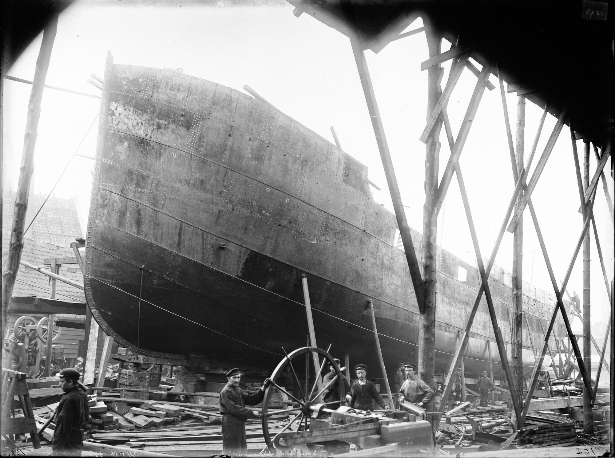 Negatief van de Britse vrachtschepen Southend en Sparrow in aanbouw voor Red Sea SS Co Ltd (bnr 91) op de werf De Nachtegaal te Amsterdam. Op de voorgrond een aantal poserende arbeiders, september 1891.