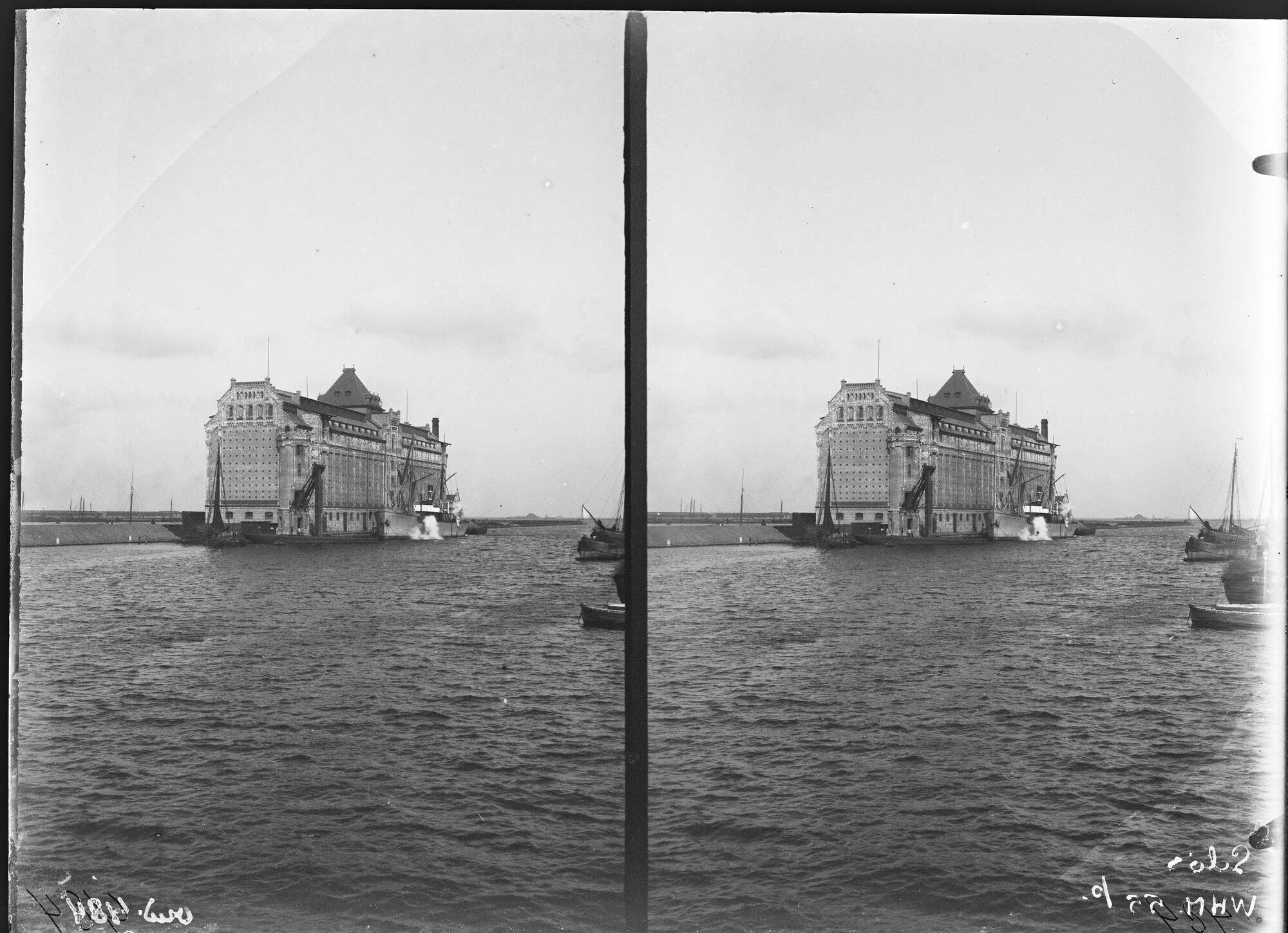 Stereonegatief van de Graansilo aan de Westerdoksdijk te Amsterdam met het "Tijdskland" op de voorgrond, maart 1898.