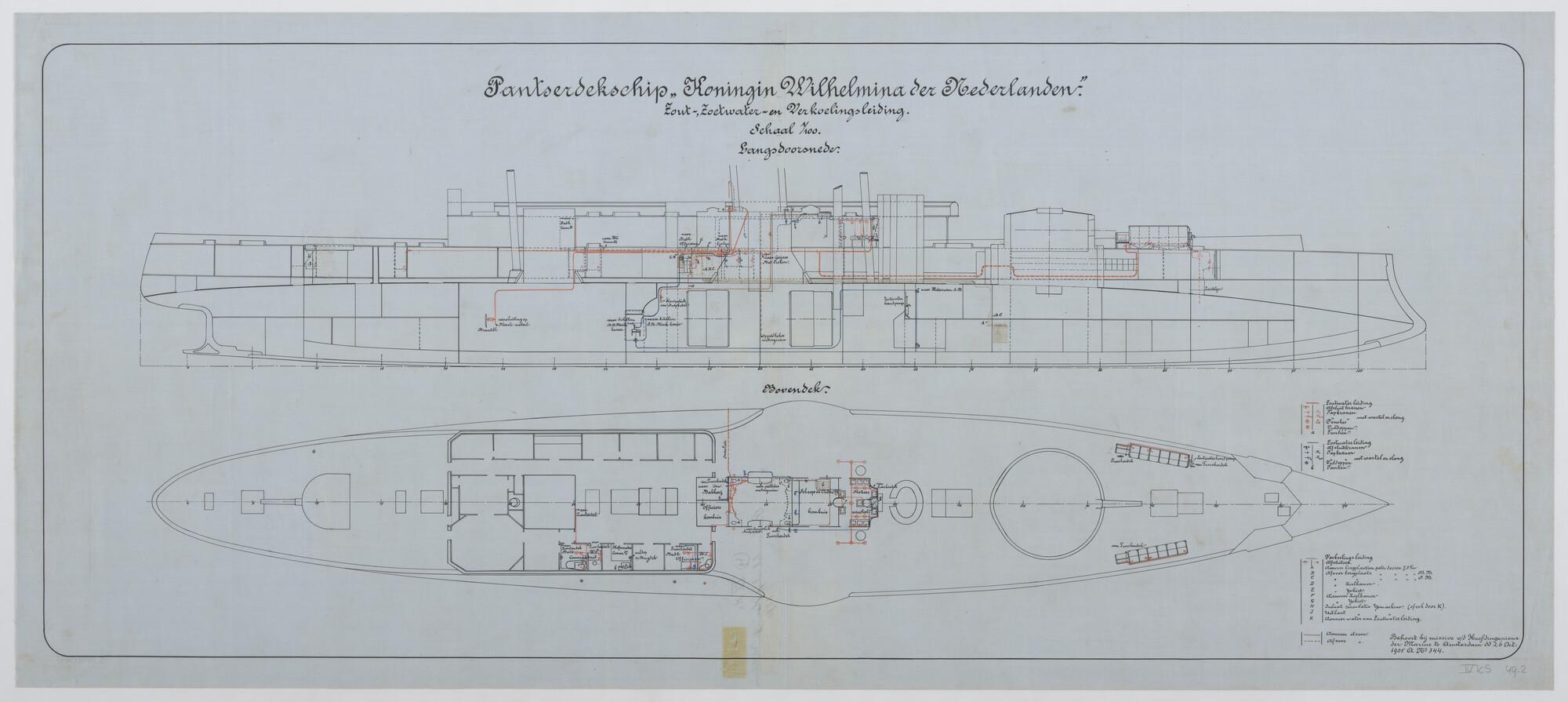 Het pantserdektorenschip Hr.Ms. "Koningin Wilhelmina der Nederlanden", 1892. Zout-, zoetwater- en verkoelingsleiding.