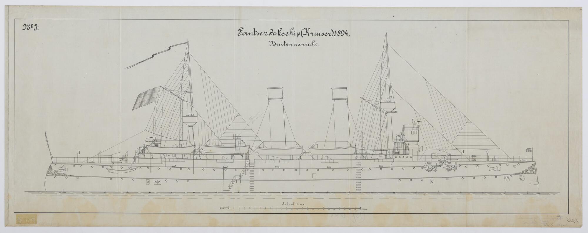 Het pantserdekschip Hr.Ms. "Holland", 1894. zijaanzicht.