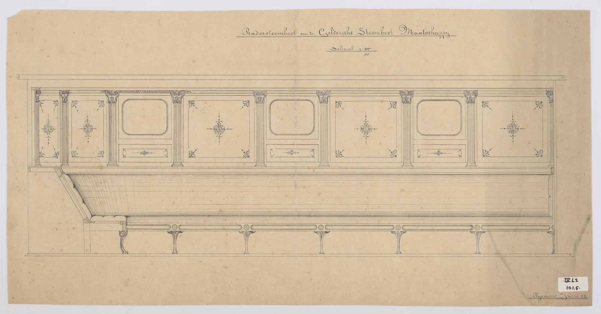 Detail van het interieur van een raderstoomschip gebouwd voor de Geldersche Stoomboot Maatschappij.