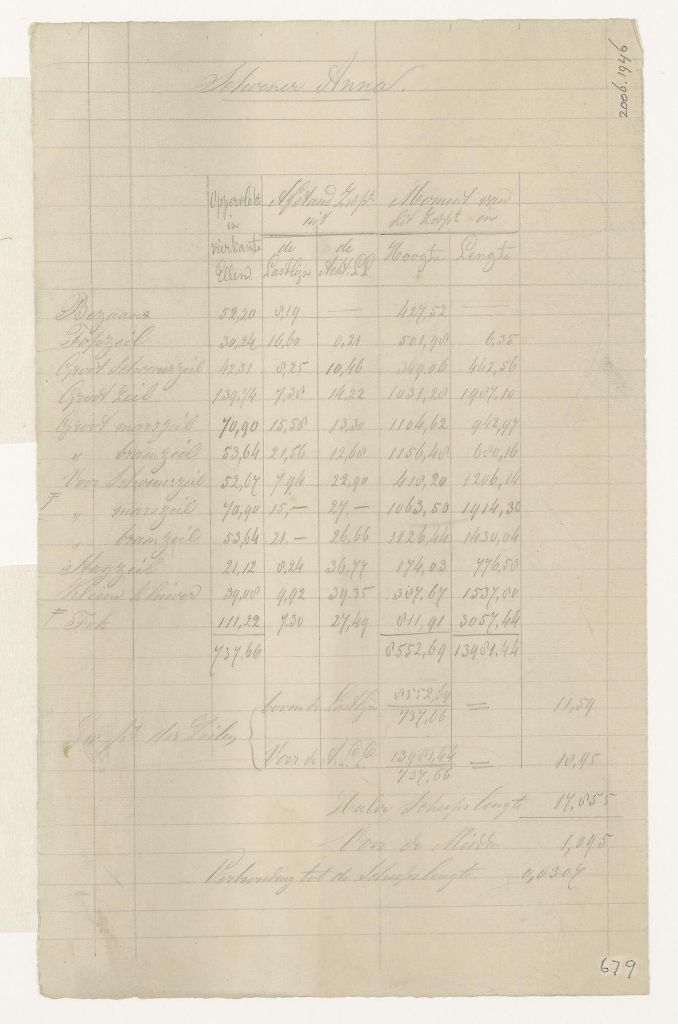 Overzicht van het zeilplan met de zeiloppervlakken van de driemast gaffelschoener Anna. Bezaan, topzeil, groot schoenerzeil, grootzeil, groot marszeil, groot bramzeil, voor schoenerzeil, voor marszeil, voor bramzeil, stagzeil, kleine kluiver, fok. Totaal oppervlak der zeilen: 737,66 vierkante ellen. Te water gelaten: 1857-04-22. Afmetingen: lengte 36.80 m, breedte 5.60, diepgang 3.60 m. Laadvermogen: 327 netto ton ...