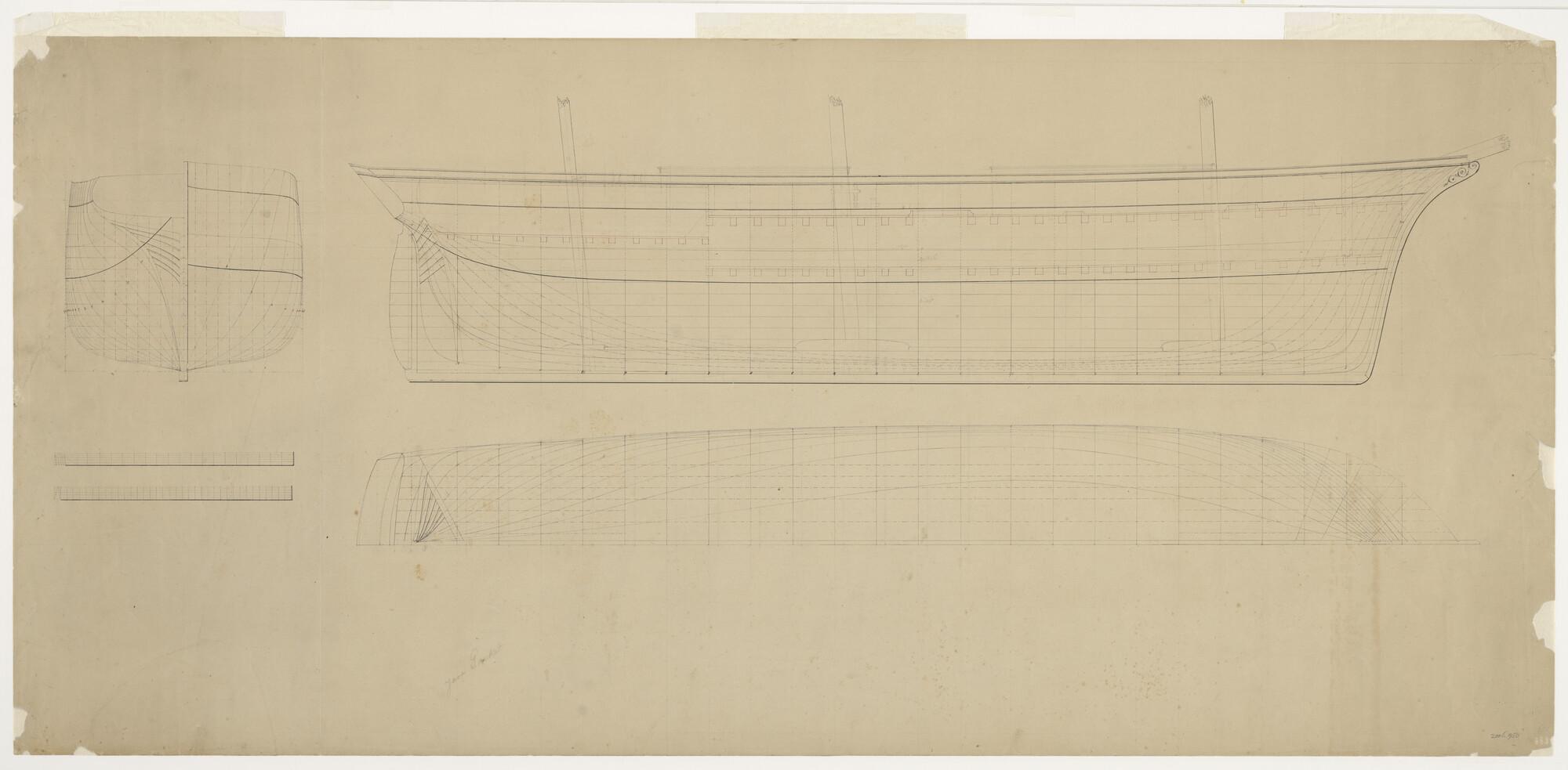 Lijnenplan en spantenraam van het koopvaardij-fregat Java Packet van ongeveer 45 meter