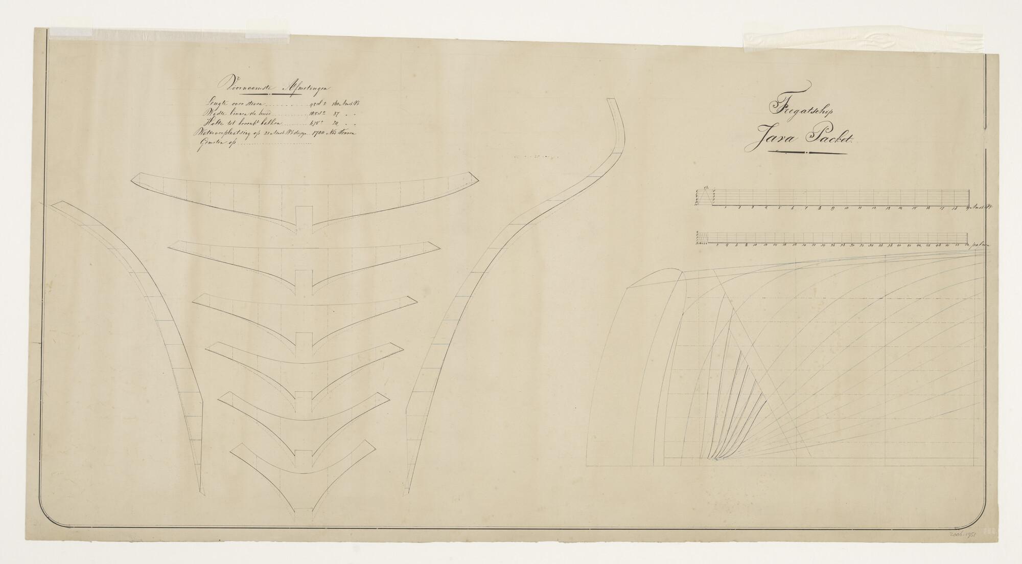 Lijnenplan en spantenconstructie van het houten driemast koopvaardij fregat-Java Packet met klippersteven. Te water gelaten: 1862-05-31. Laadvermogen 680 netto ton (oude meting). Afmetingen: lengte over de stevens ong. 45 el, wijdte binnen de huid ong. 10.5 el, holte tot de bovenste balken 6.75 el. Waterverplaatsing 1700 Nederlandse tonnen (schaal in Amsterdamsche Voeten en in palmen).