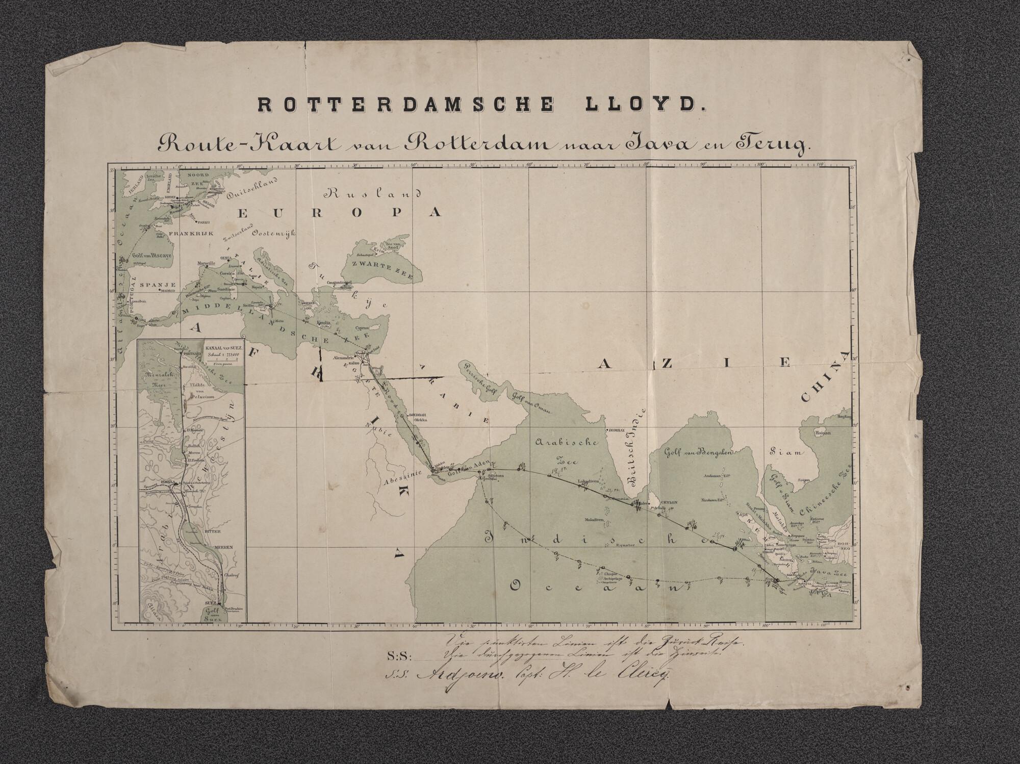 Fotoalbum met twaalf foto's uit ca. 1880 van het Suezkanaal en omgeving, met een losse kaart van de route Rotterdam-Java.