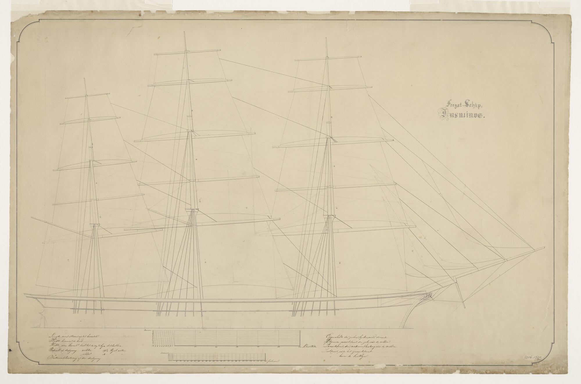 Tuig- en zeilplan van het koopvaardij-fregat Insulinde van ongeveer 50 meter