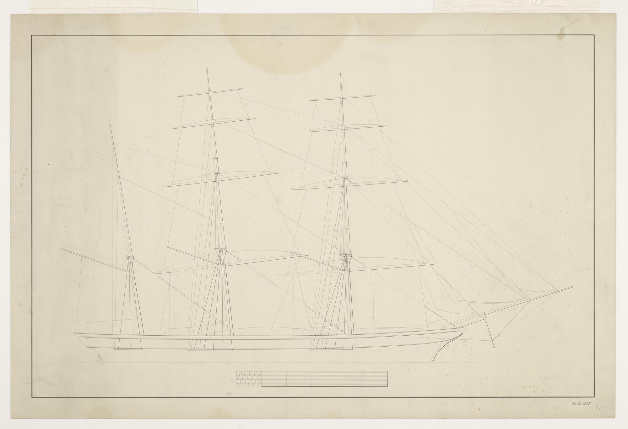 Zijaanzicht met kiel over stuurboord met tuig- en zeilplan van de houten driemastbark met klippersteven en lijzeilspieren Argonaut. Te water gelaten: 1857-12-09. Afmetingen: lengte 39.50 m, breedte 5.60 m, diepgang 3.94 m.