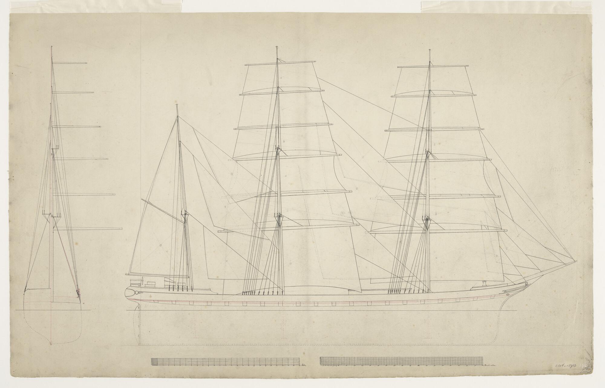Tuig- en zeilplan van het barkschip Columbus van 65.60 meter