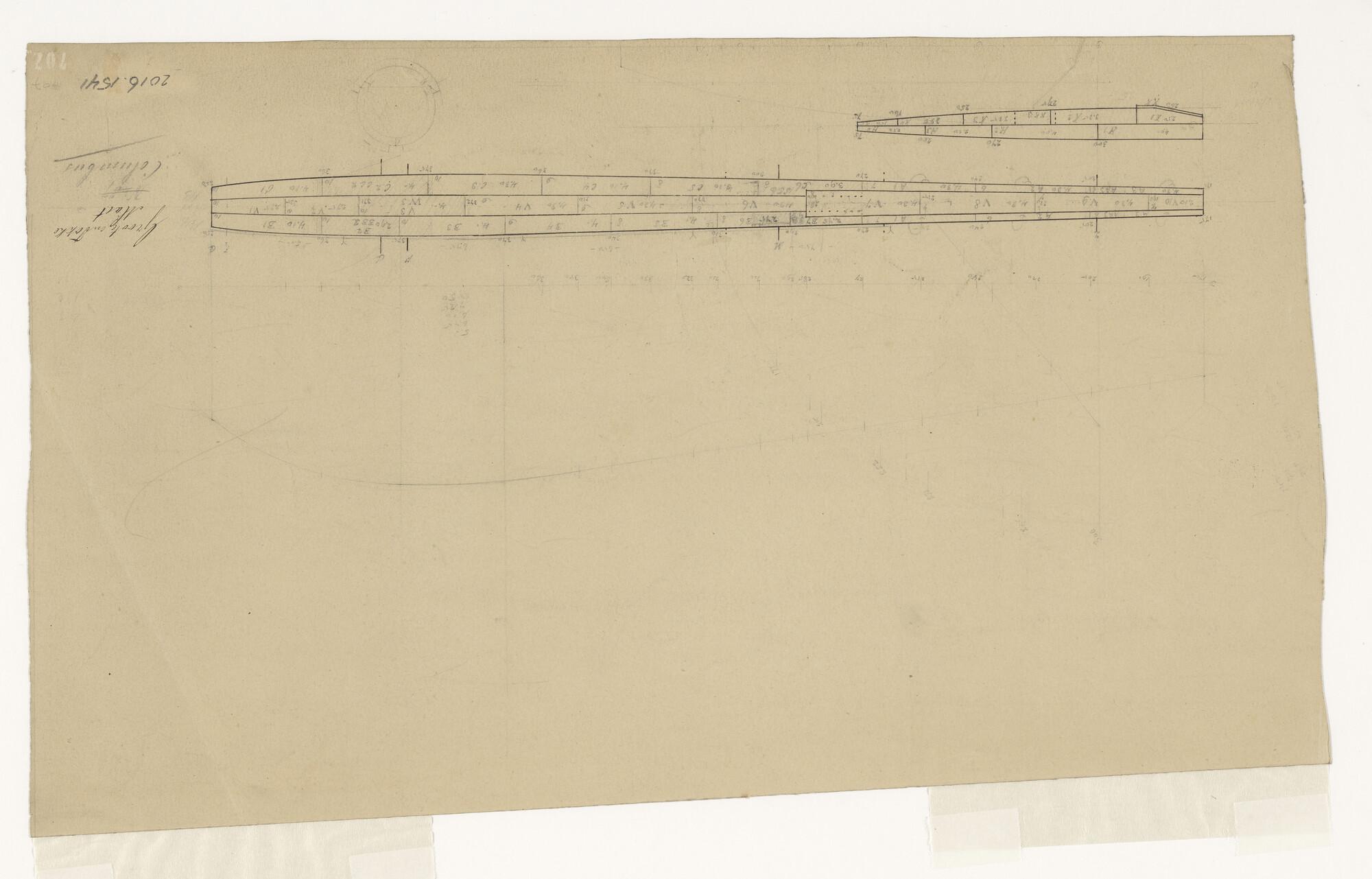 Doorsneden over de groote- en fokkemast van het barkschip Columbus van 65.60 meter