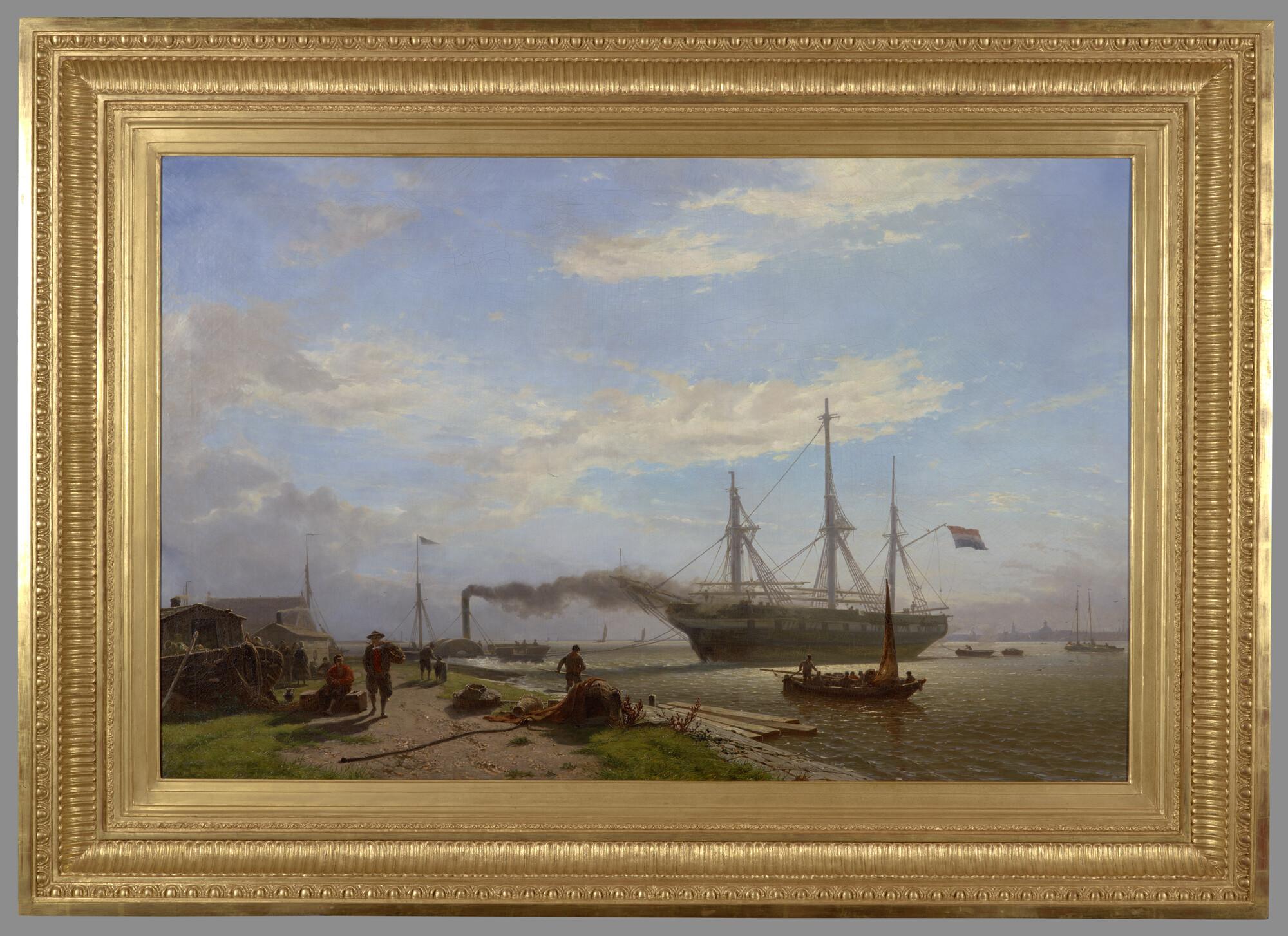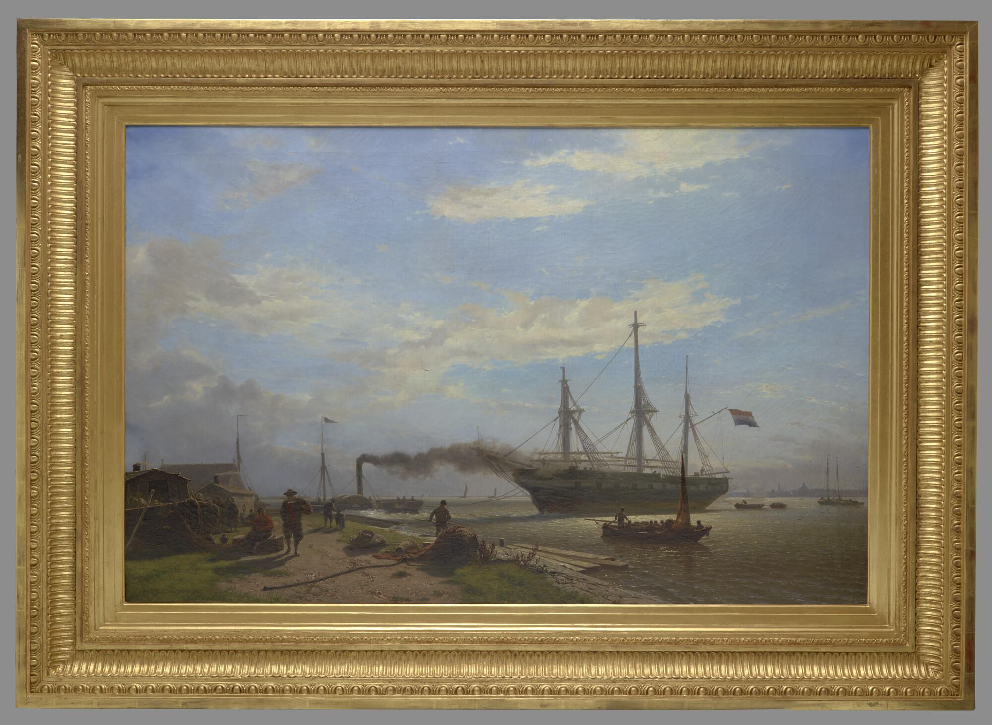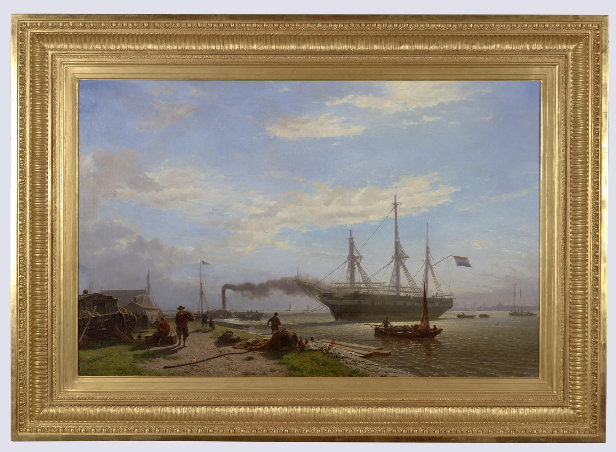 Schilderij van een raderstoomsleper voor een scheepswerf op de Noordelijke IJ-oever bij Amsterdam. Op de voorgrond links op de oever zijn vissers aan het werk. Op het water is een Waterlandse melkschuit te zien. In de achtergrond sleept een raderstoomschip een fregat, waarvan de ra's op het dek liggen, naar de scheepswerf. Aan de horizon ...