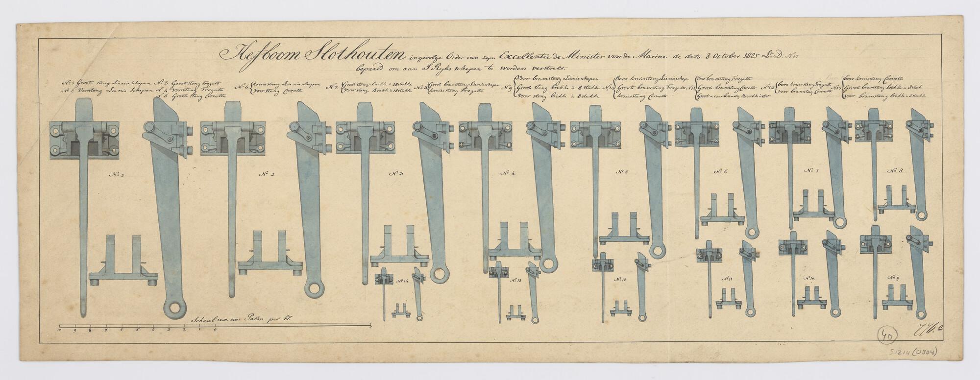 Algemeen plan van de hefboom slothouten voor linieschepen, fregatten, brikken en korvetten.