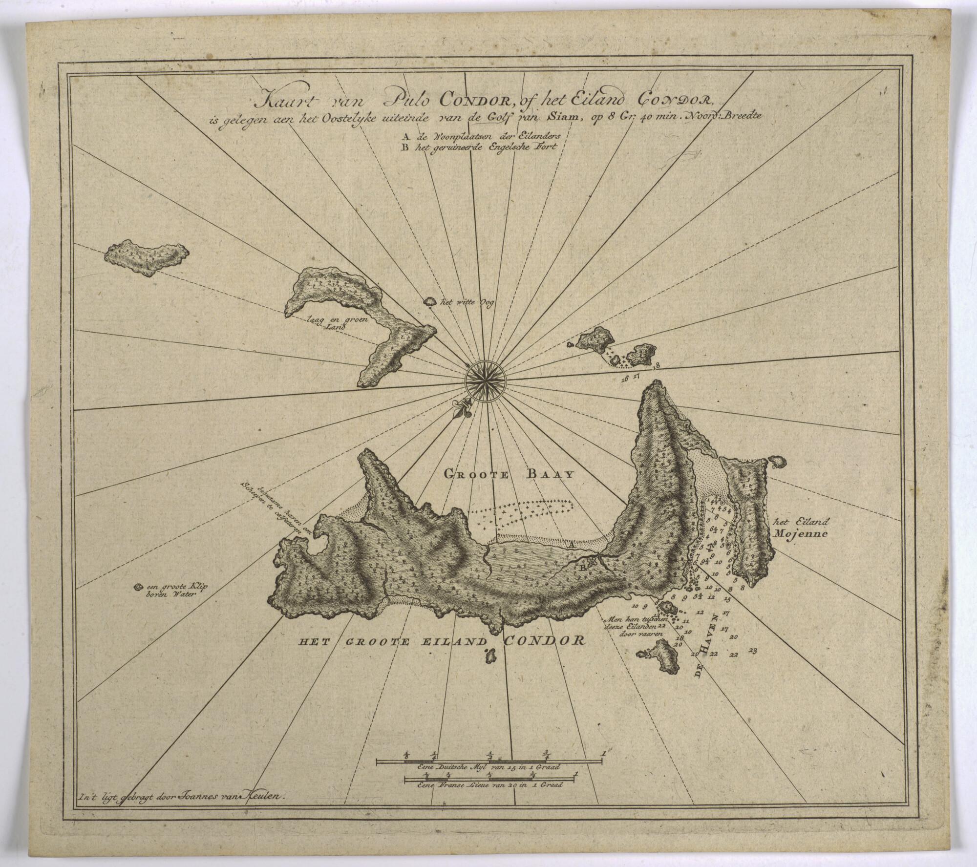 Detailkaart van het eiland Condor met omringende eilandjes in de Golf van Siam (het huidige Côn Lôn, in de archipel Côn Đảo, Vietnam). Opgenomen in van Keulen's atlas Het Oost-Indisch Zeeboek, Amsterdam, 1753.