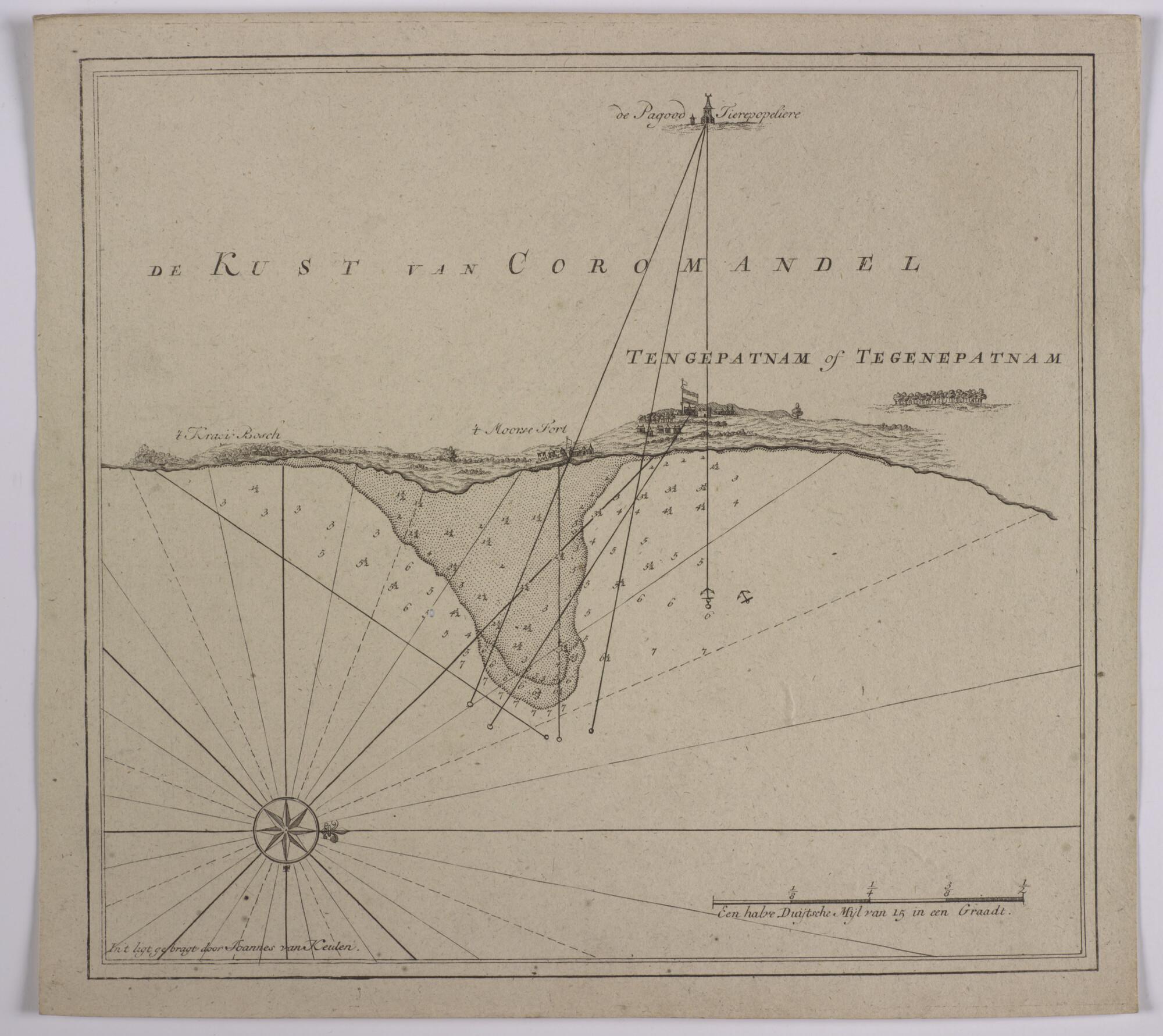 Detailkaart van de kust van Coromandel (India) bij Tengepatnam (het huidige Cuddalore). Opgenomen in van Keulen's atlas Het Oost-Indisch Zeeboek, Amsterdam, 1753.