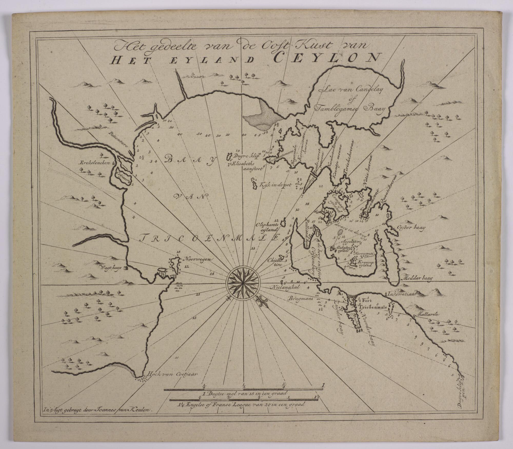Detailkaart van de Baay van Tricoenmale in Ceylon (nu de Trincomalee Baai, Sri Lanka). Opgenomen in van Keulen's atlas Het Oost-Indisch Zeeboek, Amsterdam, 1753.