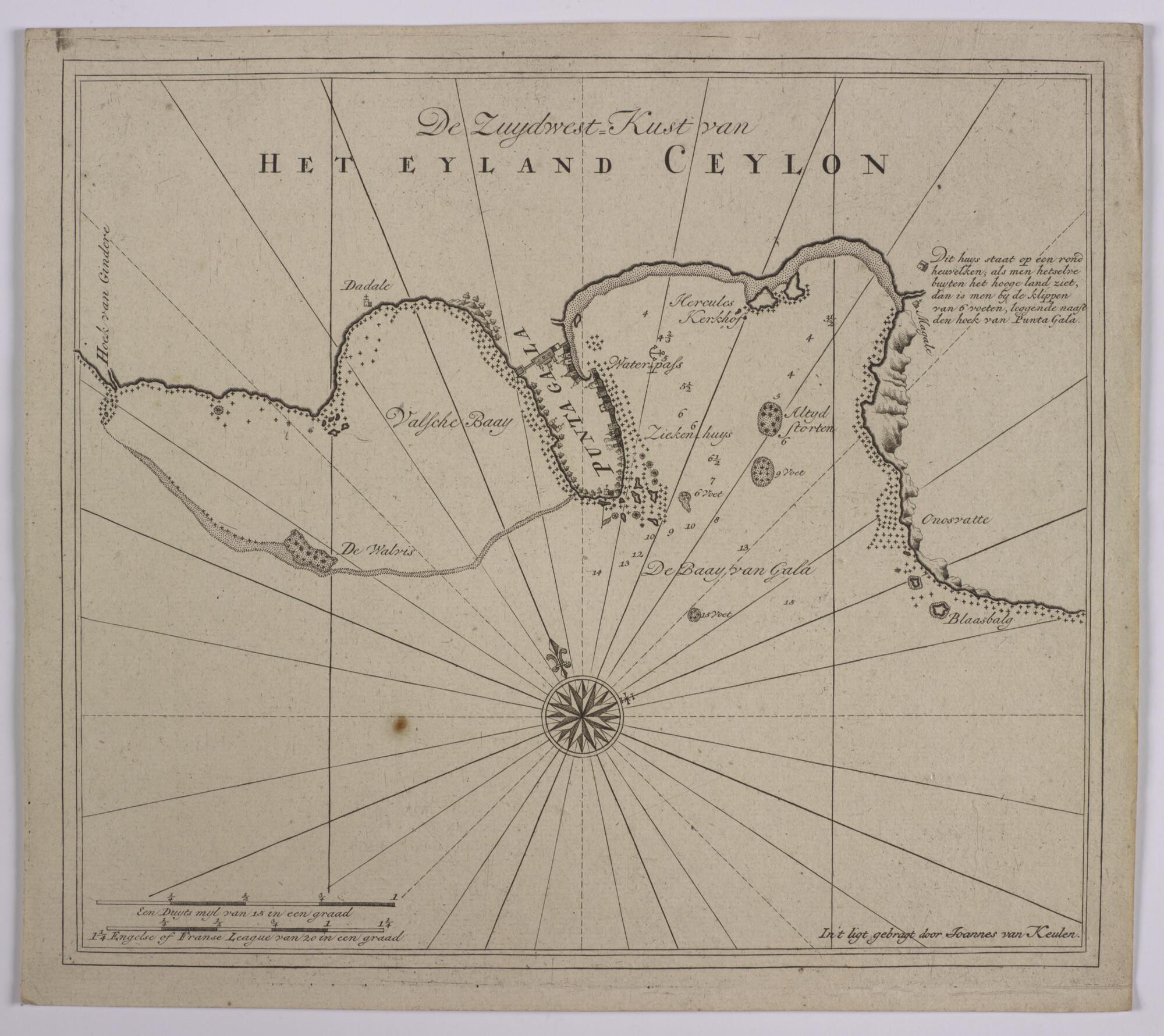 Detailkaart van de zuidwestkust van Ceylon, met Punta Gala (nu Galle, Sri Lanka), de Valsche Baay en de Baay van Gala. Opgenomen in van Keulen's atlas Het Oost-Indisch Zeeboek, Amsterdam, 1753.