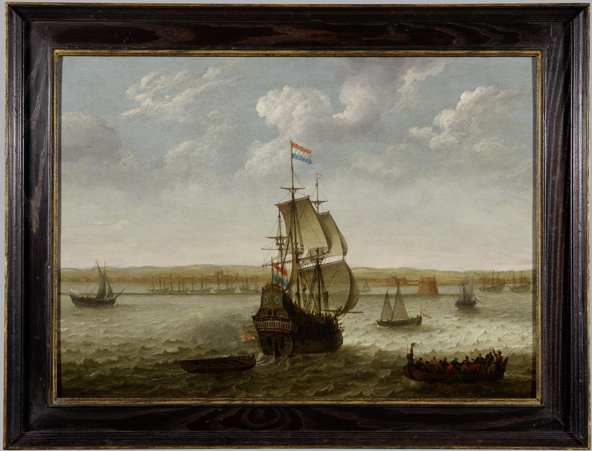 Schilderij van Nederlandse schepen op de rede van Recife, in het noordoosten van Brazilië. In lijst.