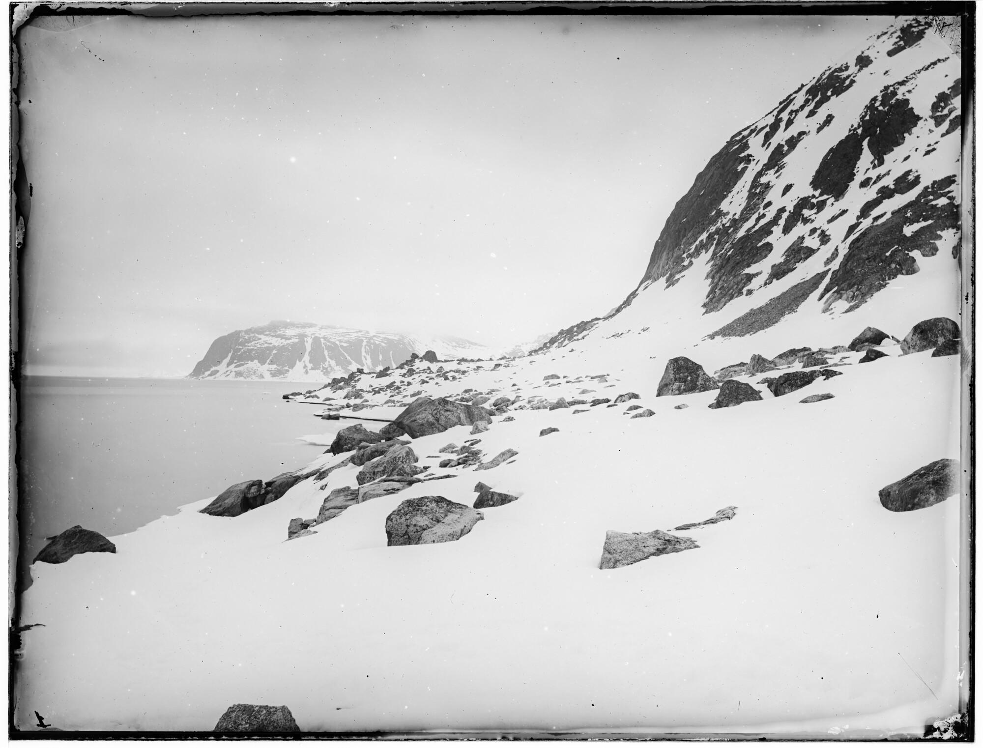 Glasnegatief van de Zeeuwse Uitkijk op Spitsbergen, gemaakt tijdens de eerste reis van de Willem Barents naar Spitsbergen en Nova Zembla in 1878. Zeeuwse Uitkijk was de naam van een zeventiende-eeuwse nederzetting van Zeeuwse walvisvaarders.