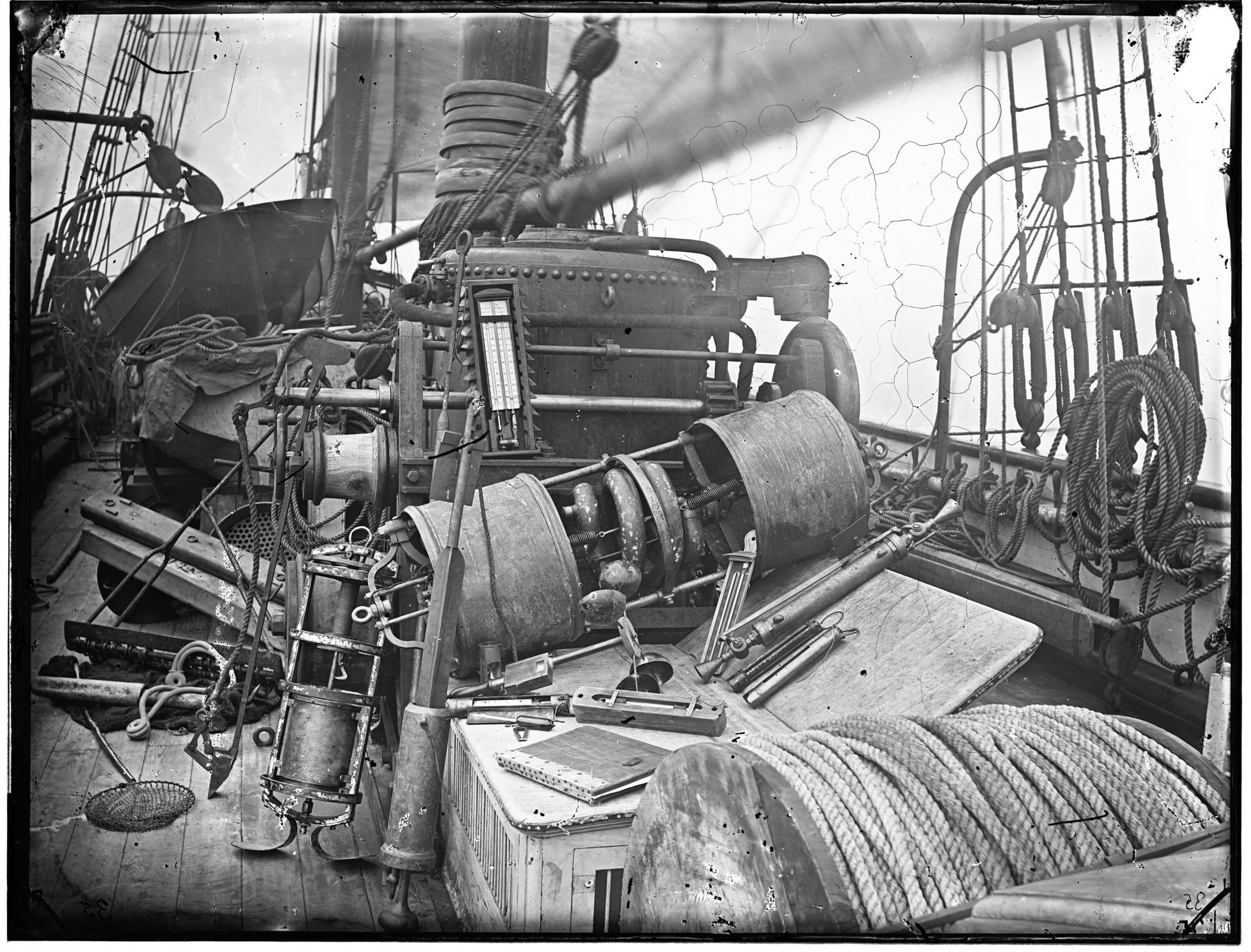 Glasnegatief van de instrumenten gebruikt voor het uitvoeren van wetenschappelijk onderzoek tijdens de eerste reis van de Willem Barents naar Spitsbergen en Nova Zembla in 1878. Gemaakt aan boord van het schip in de Matotsjkin Sjar bij Nova Zembla.