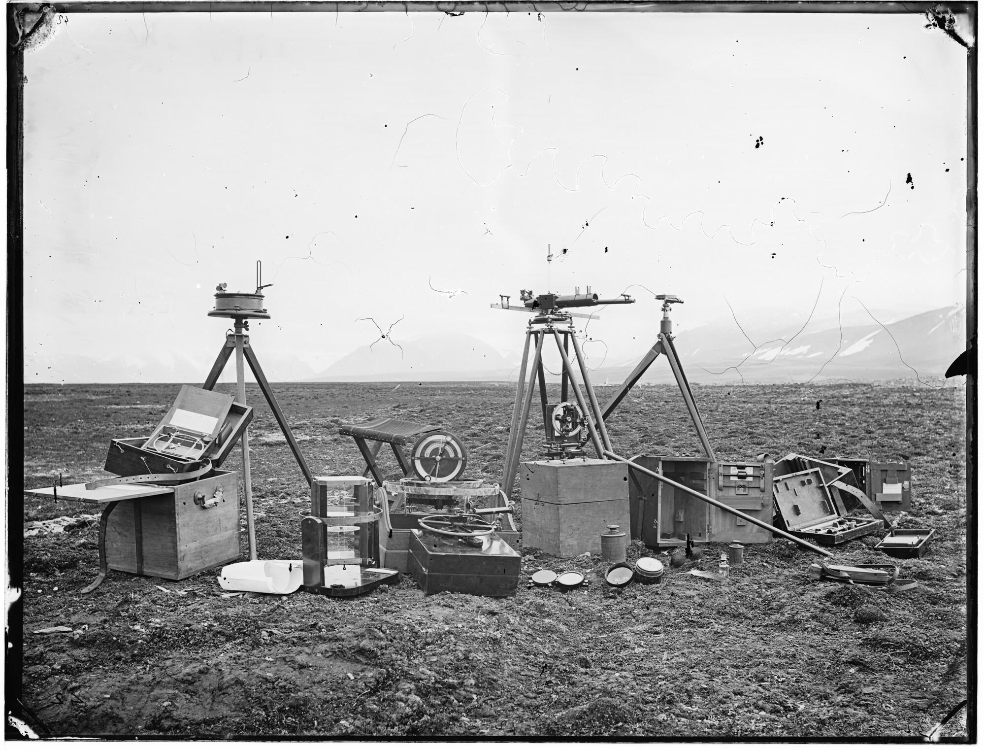 Glasnegatief van de instrumenten voor magnetische waarnemingen, gebruikt tijdens de eerste reis van de Willem Barents naar Spitsbergen en Nova Zembla in 1878.