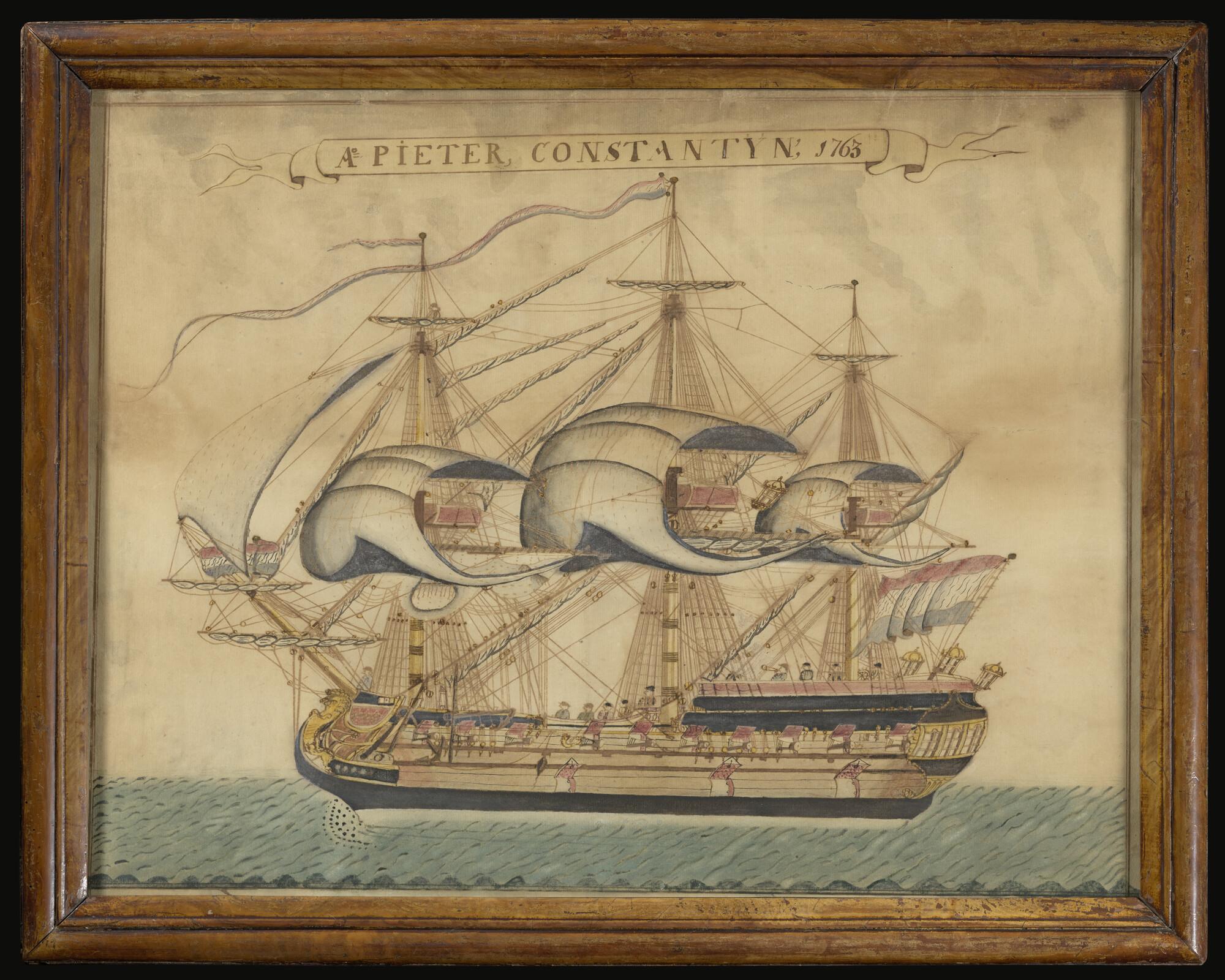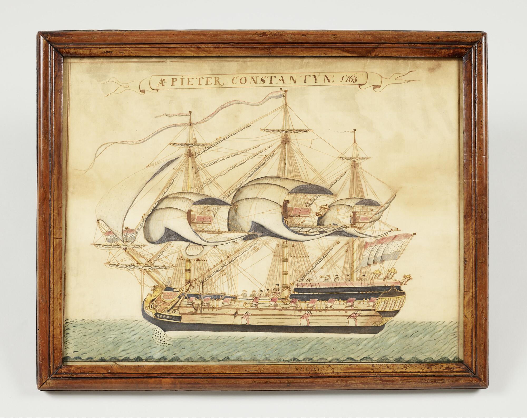 Scheepsportret van het driemastschip Pieter Constantijn. In een houten lijst.