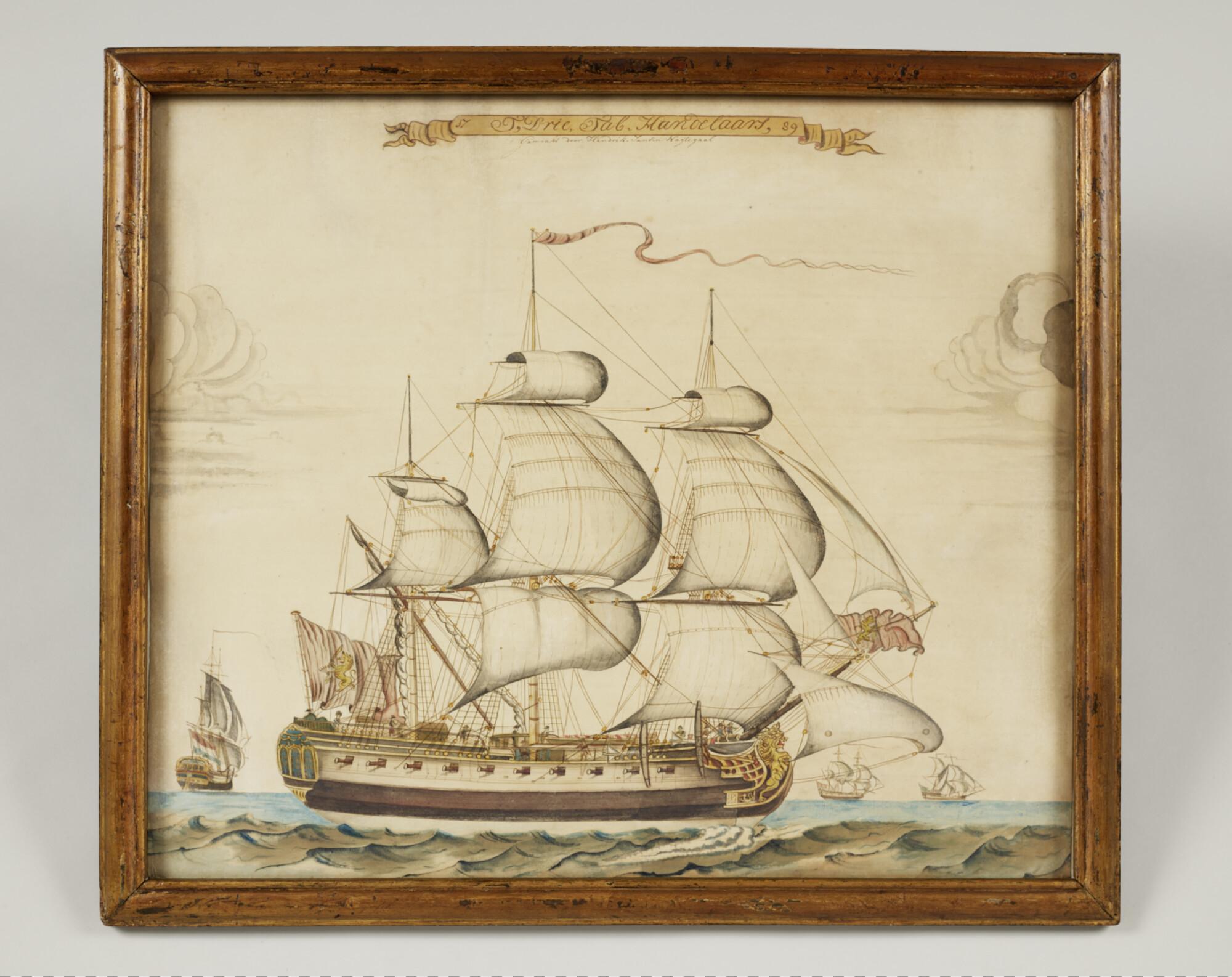 Scheepsportret van het driemastschip Het Drietal Handelaars. In een houten lijst.
