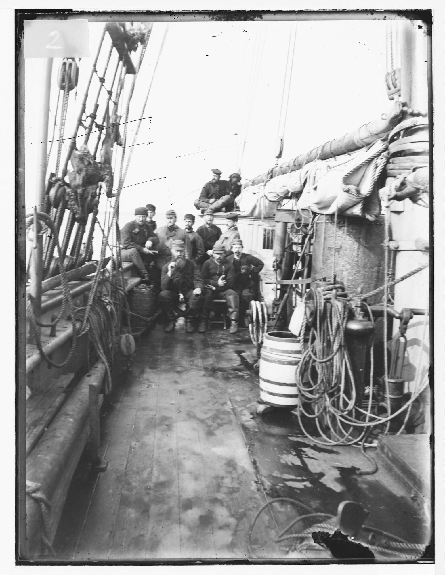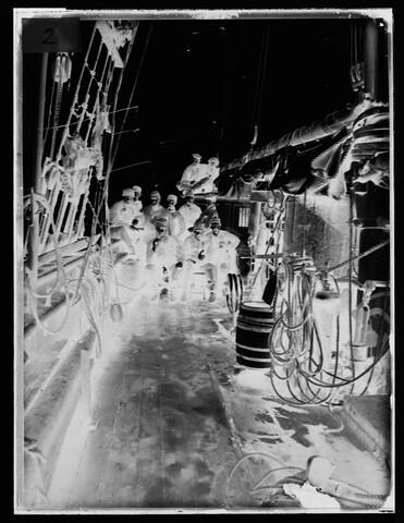 Glasnegatief van de officieren van de Varna en van Willem Barents, die samen met twee scheepshonden poseren aan boord van de Varna, in Straat Matotsjkin op 4 augustus 1882. De foto is kort genomen nadat Luitenant C. Hoffman, die het commando over de Willem Barents voerde, de verloren gewaande bemanning van de Eyre van Leigh ...