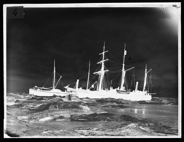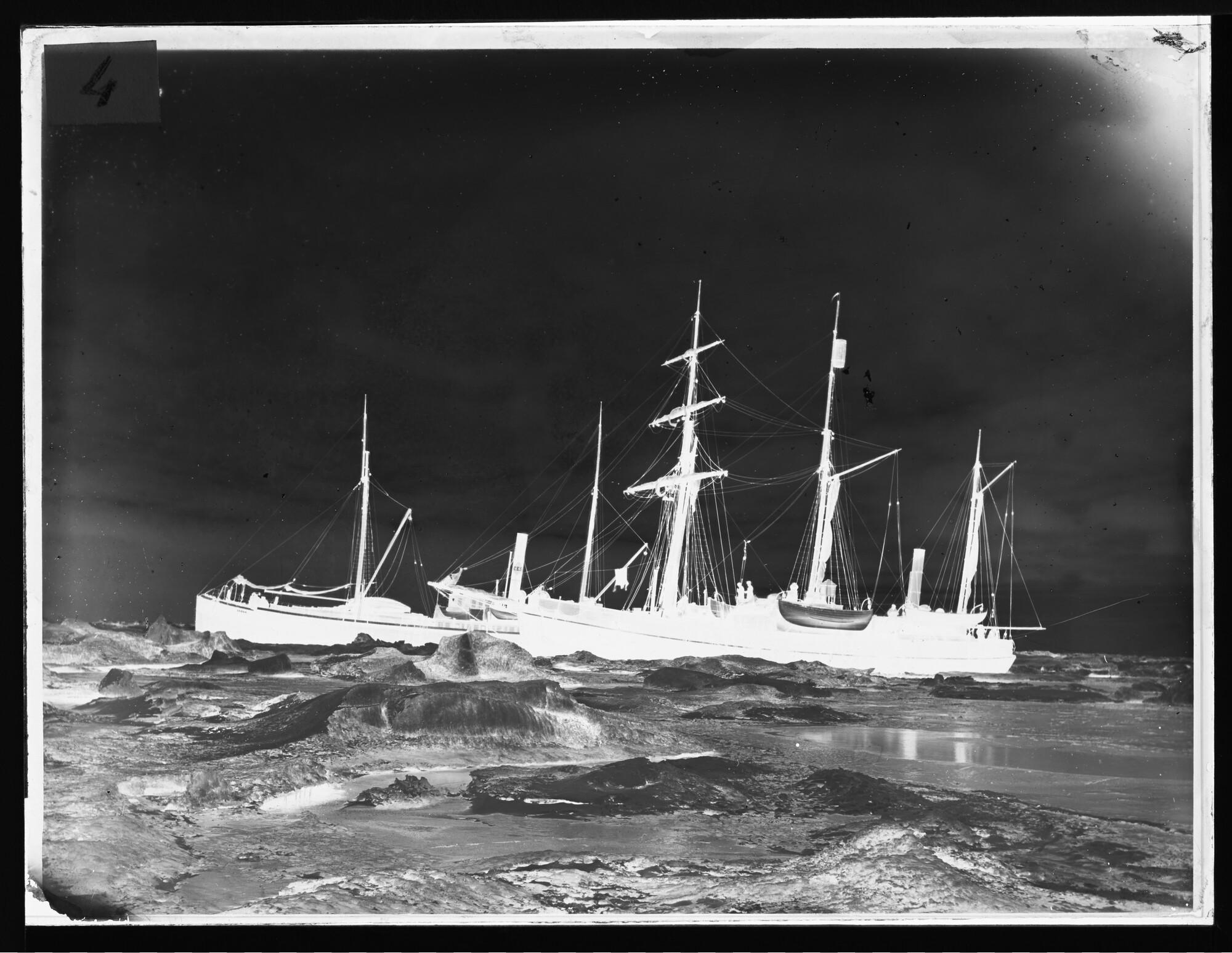 Glasnegatief van het Deense driemast stoomschip Dijmphna (op de voorgrond, onder gezag van Anders P. Hovgaard) en de Varna, daags na het vastvriezen in de Karazee, 23 september1882.