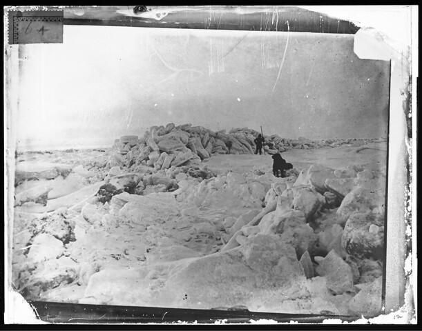 Glasdia van een toros, een opeenstapeling van ijsschotsen door verschuiving van een ijsmassa, in de Karazee op 25 oktober 1882. Op de achtergrond een expeditielid dat met behulp van een stok de stevigheid van het ijs test. Op de voorgrond de scheepshond.