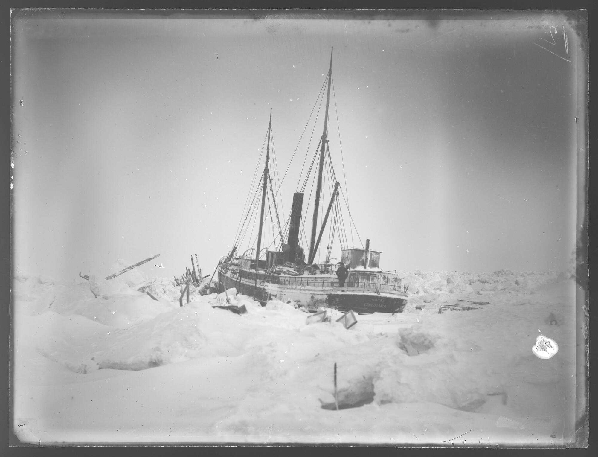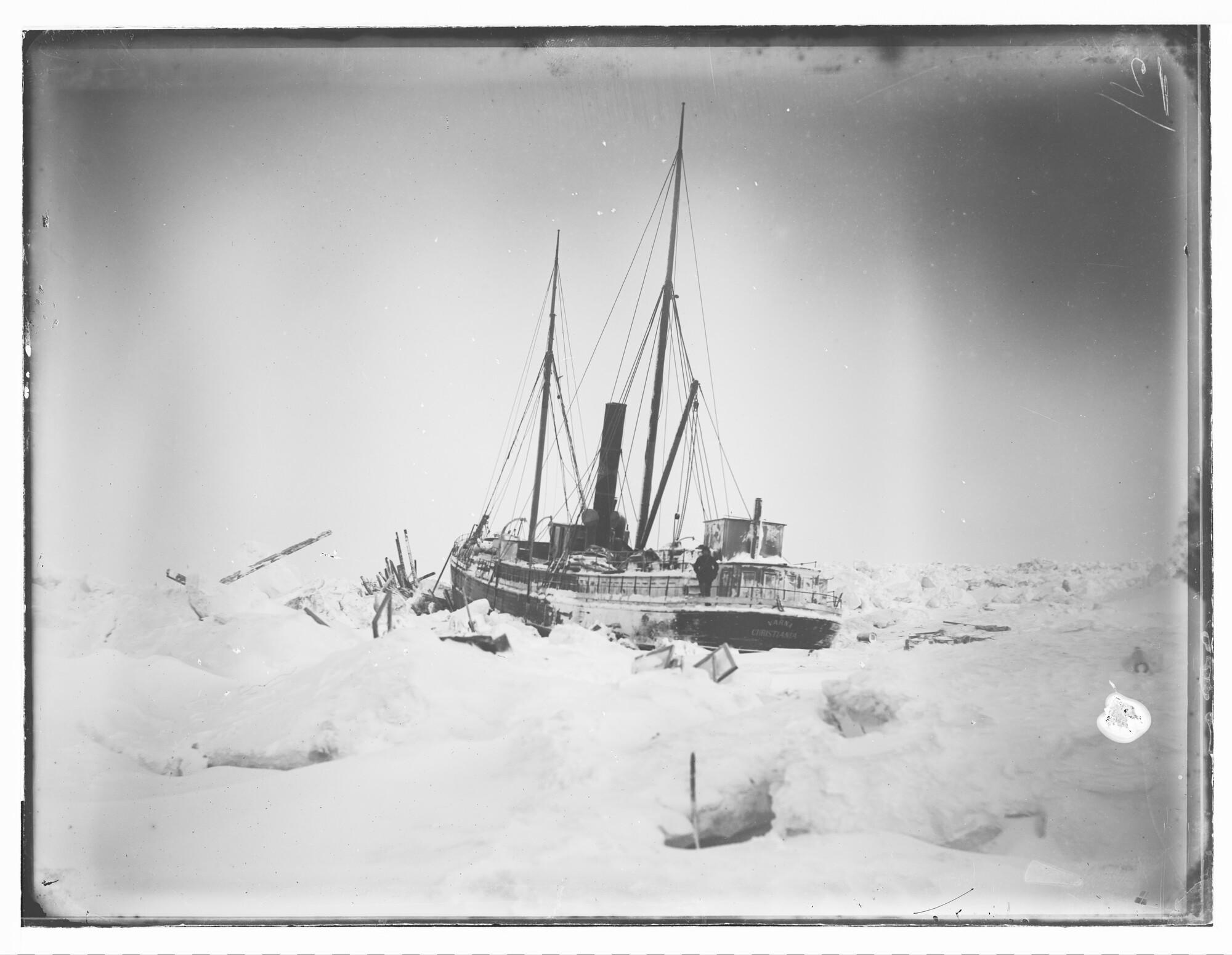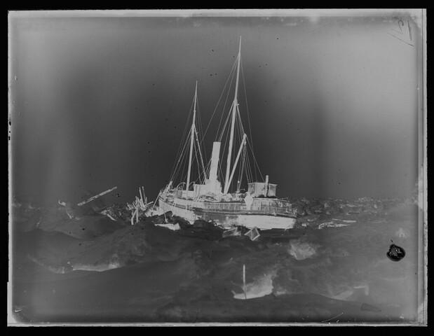 Glasnegatief van de deels beschadigde Varna, enkele weken na de tweede zware ijspersing (24 december 1882) in de Karazee, 21 januari 1883.
