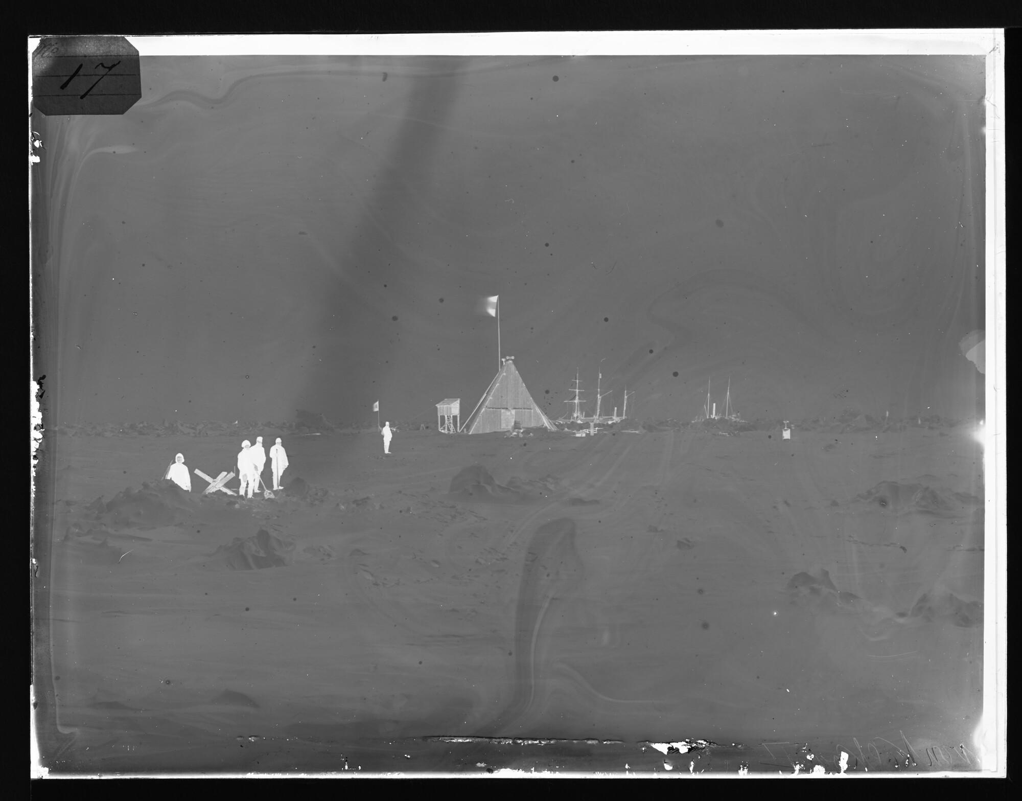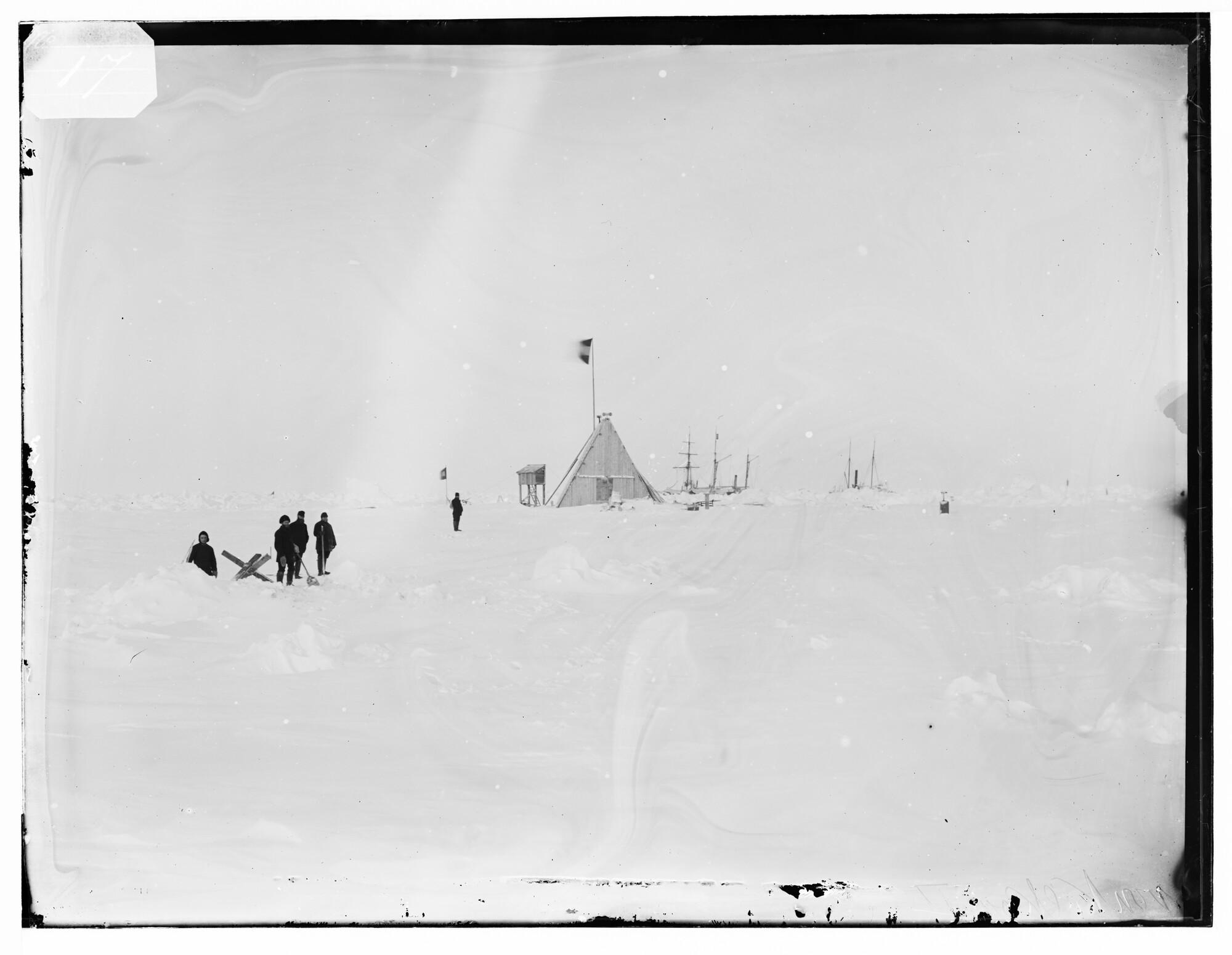 Glasnegatief van het huis op ijsschots Nieuw Holland met wapperende driekleur in top, vanuit het zuid-oosten gezien op 14 februari 1883. Op de voorgrond wordt vermoedelijk een wak in het ijs gemaakt, waarlangs de dreg gezakt kon worden. Op de achtergrond de schepen Varna en Dijmphna.