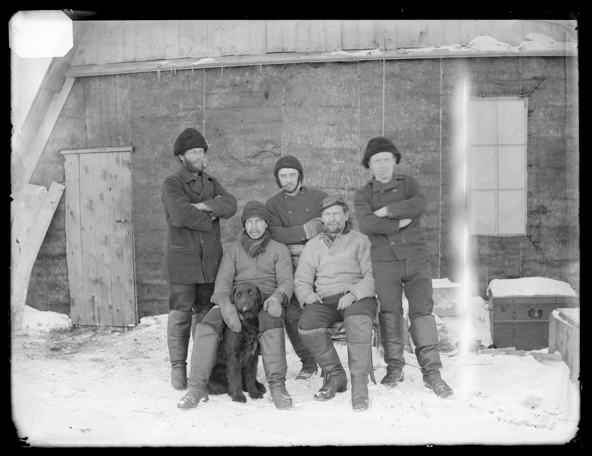 Glasnegatief van de manschappen van de Varna expeditie, poserend voor het huis op ijsschots Nieuw Holland op 1 april 1883. De Noorse timmerman Svend Pedersen (links, staand), de machinist en assistent van de arts (Hendrik Kremer) Abram Adriaan Daniel van Dolder (midden, achter), lid van de Huishoudelijke Dienst Christiaan Moritz Beutler (rechts, staand), kok en ...