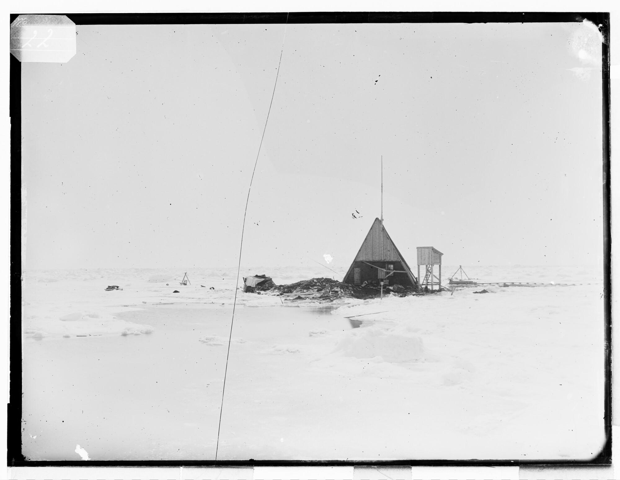 Glasnegatief van het huis op ijsschots Nieuw Holland in de Karazee vanuit het noord-westen gezien op 20 juni 1883. Een deel van het ijs is gesmolten.