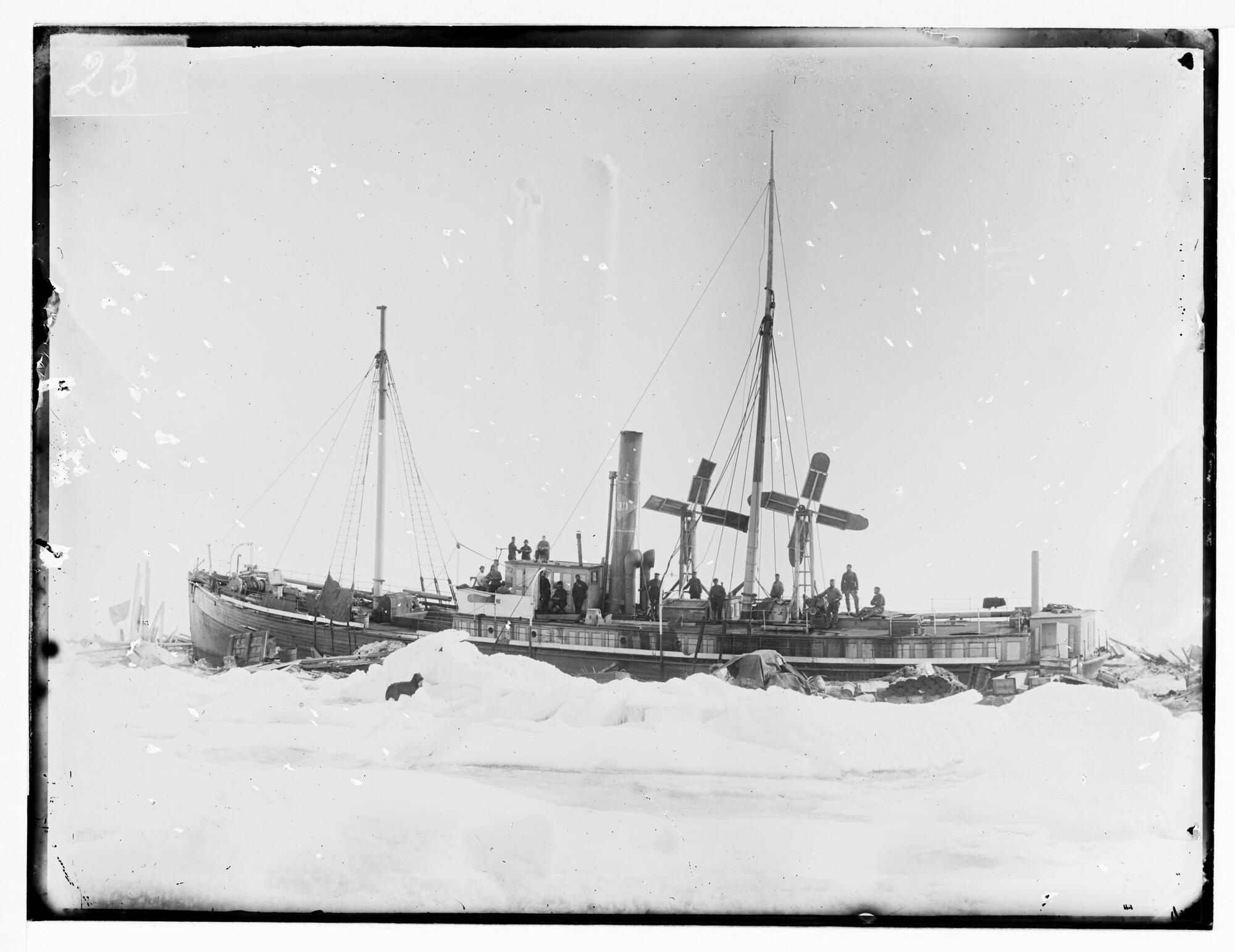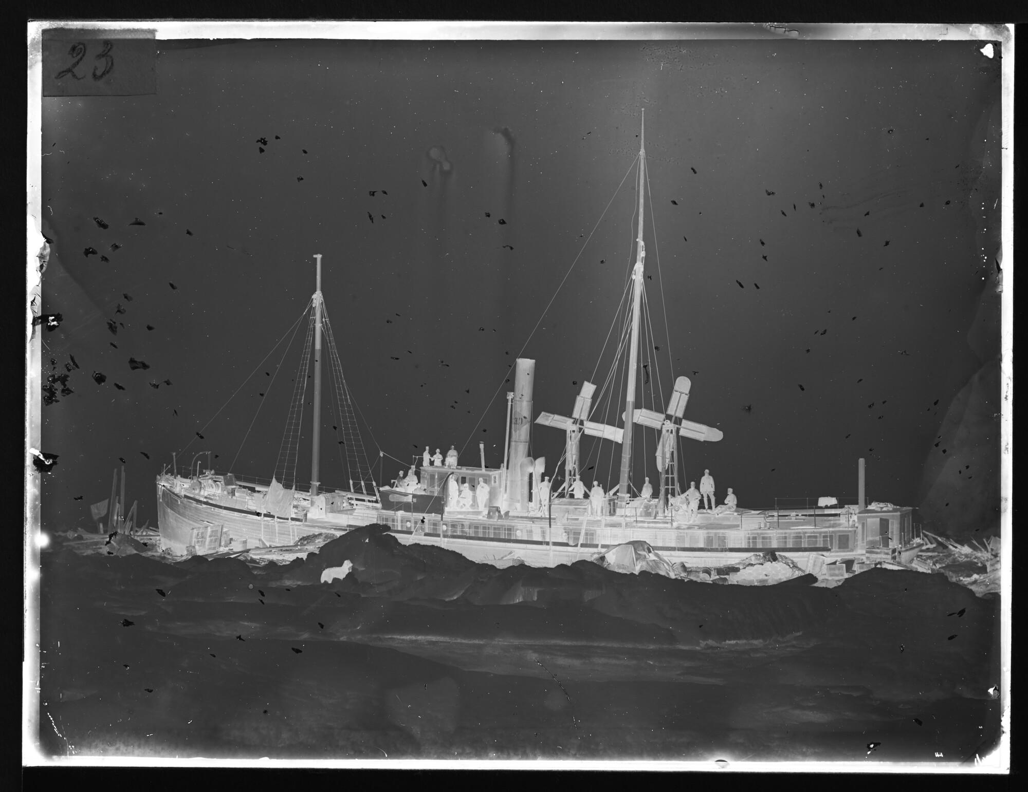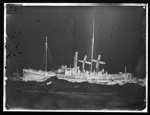 Glasnegatief van het leegpompen van de Varna op 22 juni 1883. De door de ijspersingen lekgeslagen Varna zakte in het voorjaar door het smelten van het ijs steeds dieper het water in. Om zoveel mogelijk smeltwater te kunnen wegpompen liet kapitein Knudsen twee windmolens aan dek bouwen als extra aandrijvers van de handlenspompen. Links op ...